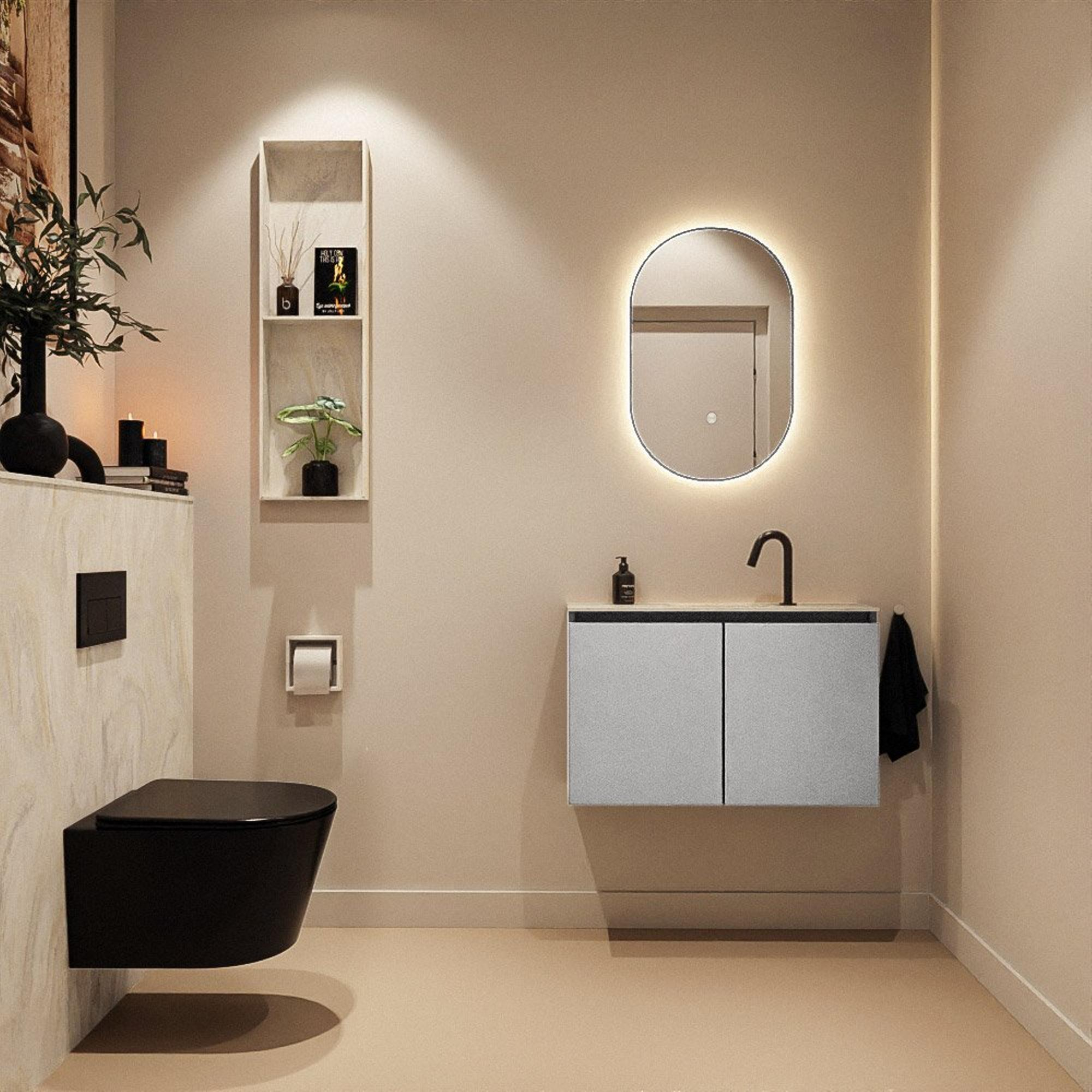 La combinaison du meuble gris couleur Plata avec le plan crème en solid surface et la vasque Eden dans la teinte Ostra offre une allure luxueuse et contemporaine. La façade sans poignées crée un jeu de lignes épuré et permet au meuble de s'intégrer parfaitement dans les intérieurs modernes et minimalistes. Le MDF comme matériau de base offre une structure solide, tandis que le plan en solid surface est réputé pour son look épuré et sa finition haut de gamme. Les transitions douces des couleurs de la vasque créent un contraste subtil avec le meuble, donnant ainsi à vos toilettes une apparence soignée et digne d'un design de qualité.