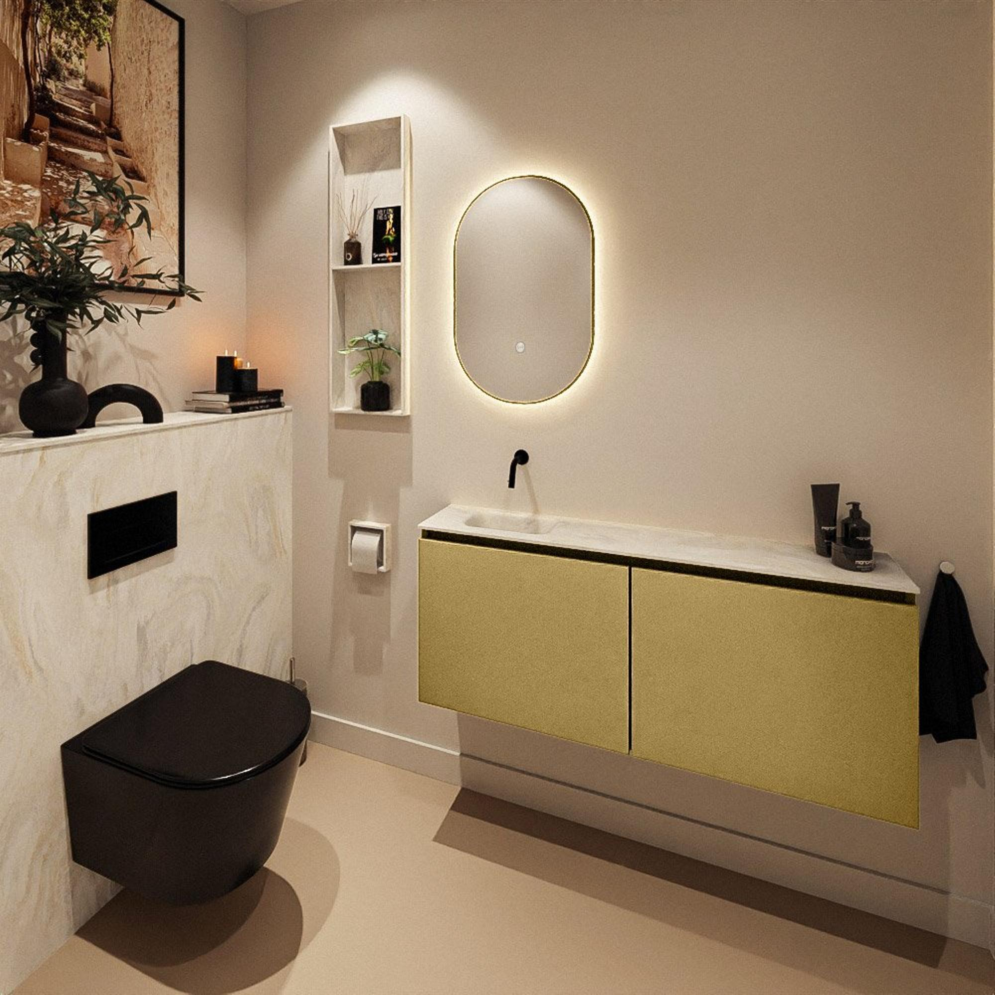 Avec ses lignes épurées, ses façades sans poignées et sa finition dorée chaleureuse, ce meuble est un véritable accroche-regard dans tout espace WC moderne. La combinaison avec le plan de lavabo de couleur crème crée une apparence luxueuse, presque semblable au marbre, qui s’intègre parfaitement dans les intérieurs chic façon hôtel et les designs contemporains. La largeur de 120 cm offre un jeu de lignes horizontales généreux le long du mur, tandis que la profondeur de seulement 23 cm garde l’ensemble fin et aérien. Ainsi, vous profitez d’un espace qui paraît plus grand, sans que le meuble ne devienne trop imposant. Cela en fait un excellent choix si vous souhaitez créer un effet de style dans vos toilettes d’invités, tout en restant attentif à l’espace de circulation et à la fonctionnalité.