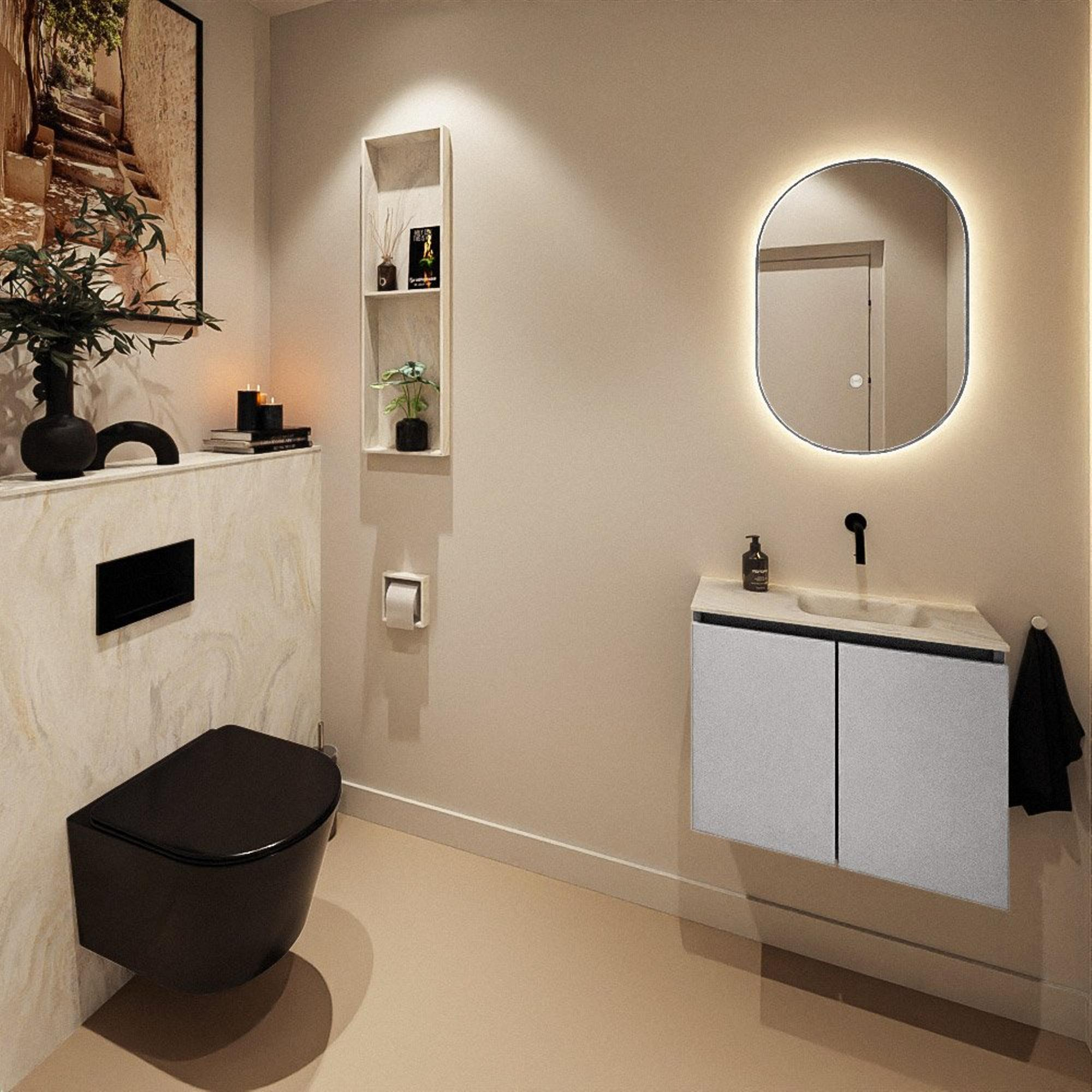 Avec ce meuble WC compact, vous créez en une seule fois une solution soignée, moderne et pratique pour vos toilettes ou votre petite salle de bains. Grâce à ses dimensions peu profondes, il s’intègre facilement dans les espaces étroits, tout en vous offrant un lavabo complet et un espace de rangement pratique. La combinaison d’un meuble bas aux lignes épurées dans une teinte de gris moderne et d’un lavabo en solid surface dans une nuance crème douce offre un aspect calme et élégant, ce qui s’accorde parfaitement avec un style contemporain, minimaliste ou hôtel chic. Ce meuble est particulièrement adapté à ceux qui souhaitent finir leurs toilettes proprement, dissimuler les siphons et conduites apparents et rechercher une solution solide et durable qui reste belle pendant de nombreuses années. Grâce au lavabo avec cuve à droite et sans trou de robinet, c’est en outre un choix judicieux si vous souhaitez utiliser un robinet encastré ou mural afin de créer une apparence encore plus luxueuse.
