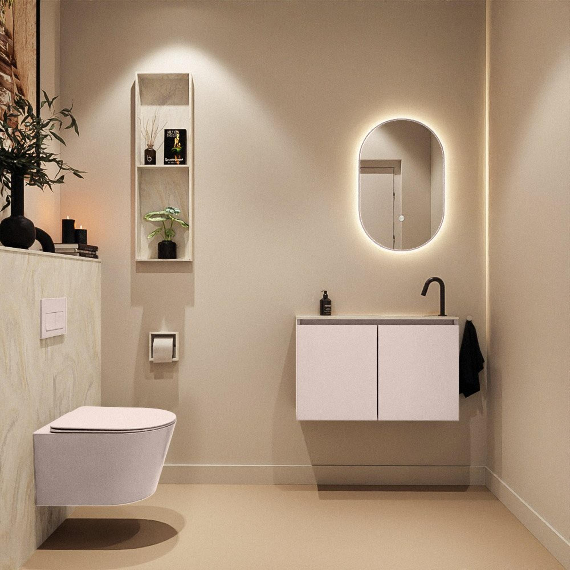 La combinaison de la couleur Rosee du meuble avec le plan de lavabo couleur crème offre une apparence douce, moderne et pourtant marquante. Cela rend le meuble parfait comme élément accrocheur dans un WC invités ou une petite salle de bains dans laquelle vous souhaitez créer un peu plus d’ambiance. Les lignes épurées, les façades sans poignées et la forme peu profonde donnent un look minimaliste qui s’adapte parfaitement aux intérieurs modernes et scandinaves, mais qui se combine aussi étonnamment bien avec des robinets et accessoires noirs, dorés ou chromés. Vous créez ainsi très facilement un espace WC cohérent et élégant qui ressemble à un petit coin design dans la maison.