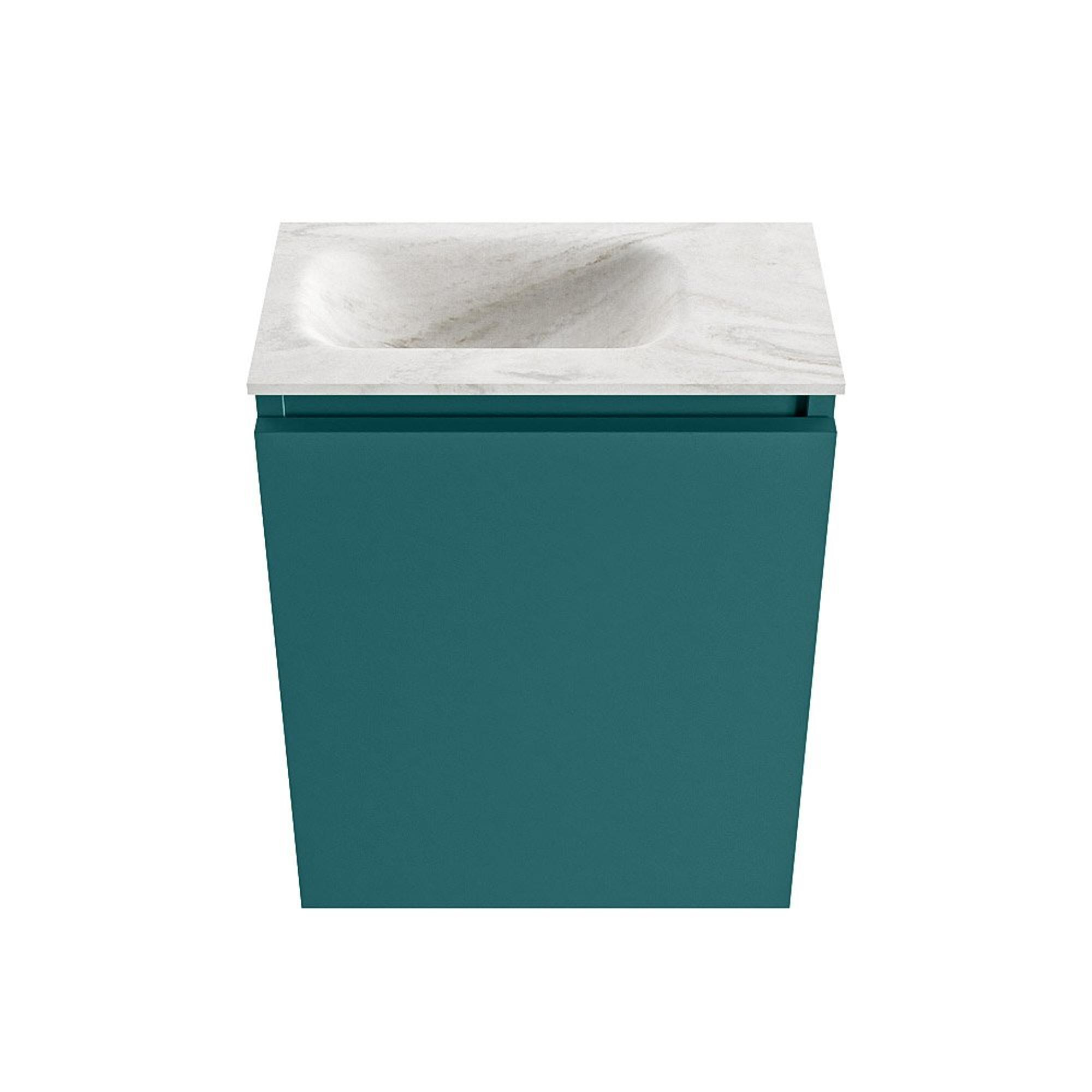 La combinaison de la couleur moderne Smag pour le meuble et de la vasque crème Eden en solid surface offre un aspect chic et contemporain. Smag, une teinte douce de vert, apporte calme et atmosphère naturelle à votre espace, tandis que la partie supérieure claire crée un contraste frais. Ce jeu de couleurs permet de combiner facilement avec d'autres accessoires de salle de bains en noir, chrome ou métal brossé, par exemple. La façade sans poignée renforce le caractère minimaliste et garantit un ensemble visuellement épuré