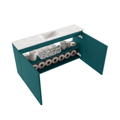 Les lignes droites, les façades sans poignées et la teinte verte moderne créent ensemble un look raffiné et contemporain. La couleur Smag offre une apparence subtile et luxueuse qui se marie à merveille avec des carreaux blancs, couleur sable ou au contraire foncés. Le plan vasque crème forme un contraste apaisant et donne à votre espace une impression optique de grandeur et de luminosité. Grâce à la largeur de 100 cm, vos toilettes se transforment en un véritable mur-meuble au lieu d’une simple petite fontaine, ce qui apporte immédiatement plus d’ambiance et une apparence étudiée digne d’un véritable intérieur. Grâce aux formes épurées et au design minimaliste, ce meuble s’intègre parfaitement dans les salles de bains et toilettes modernes, scandinaves et style hôtel chic.
