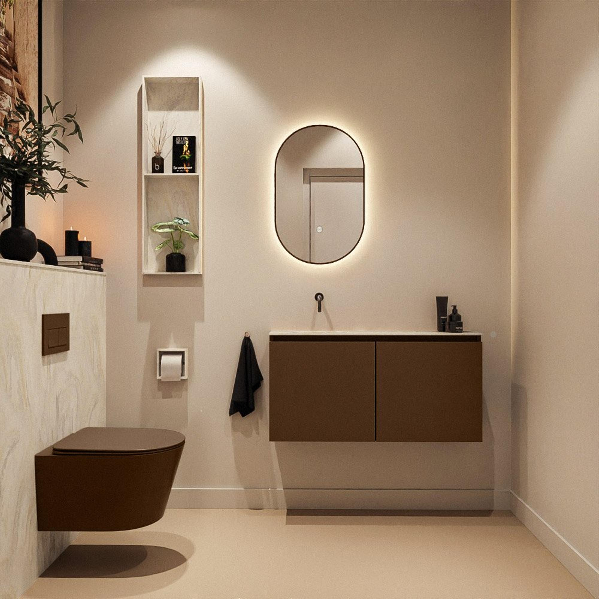 - Meuble moderne couleur Rust (brun) avec façades sans poignées pour une apparence épurée et calme.
