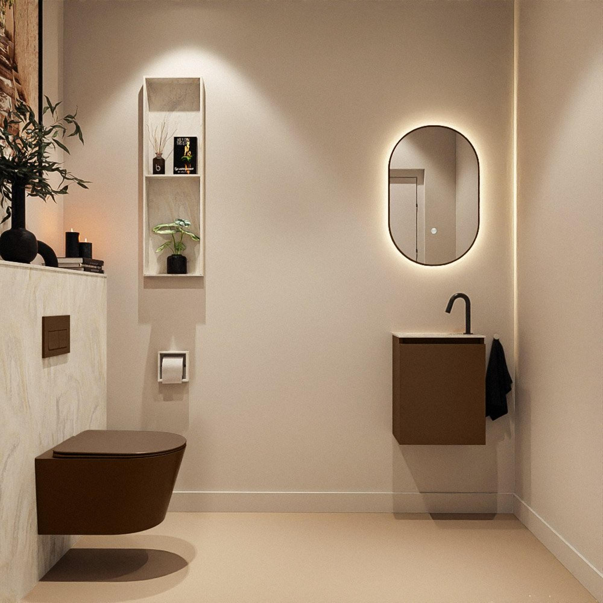 La finition couleur rust confère à ce meuble une allure chaleureuse et accueillante, tandis que les lignes épurées et les façades sans poignées offrent un look moderne et minimaliste. Cette combinaison permet de l’harmoniser facilement avec des salles de bains de style industriel, moderne ou scandinave. La porte sans poignée s’ouvre confortablement et contribue à une apparence calme et ordonnée, sans perturbation visuelle due aux poignées ou boutons. Associé au lavabo Ostra clair en ton crème, votre espace WC gagne en luxe et en modernité, comme une mini salle de bains d’hôtel à la maison. N’hésitez pas à choisir des accessoires tels que brosse WC, poubelle et serviette dans les mêmes tons chauds ou au contraire en noir ou en chrome pour un ensemble harmonieux.