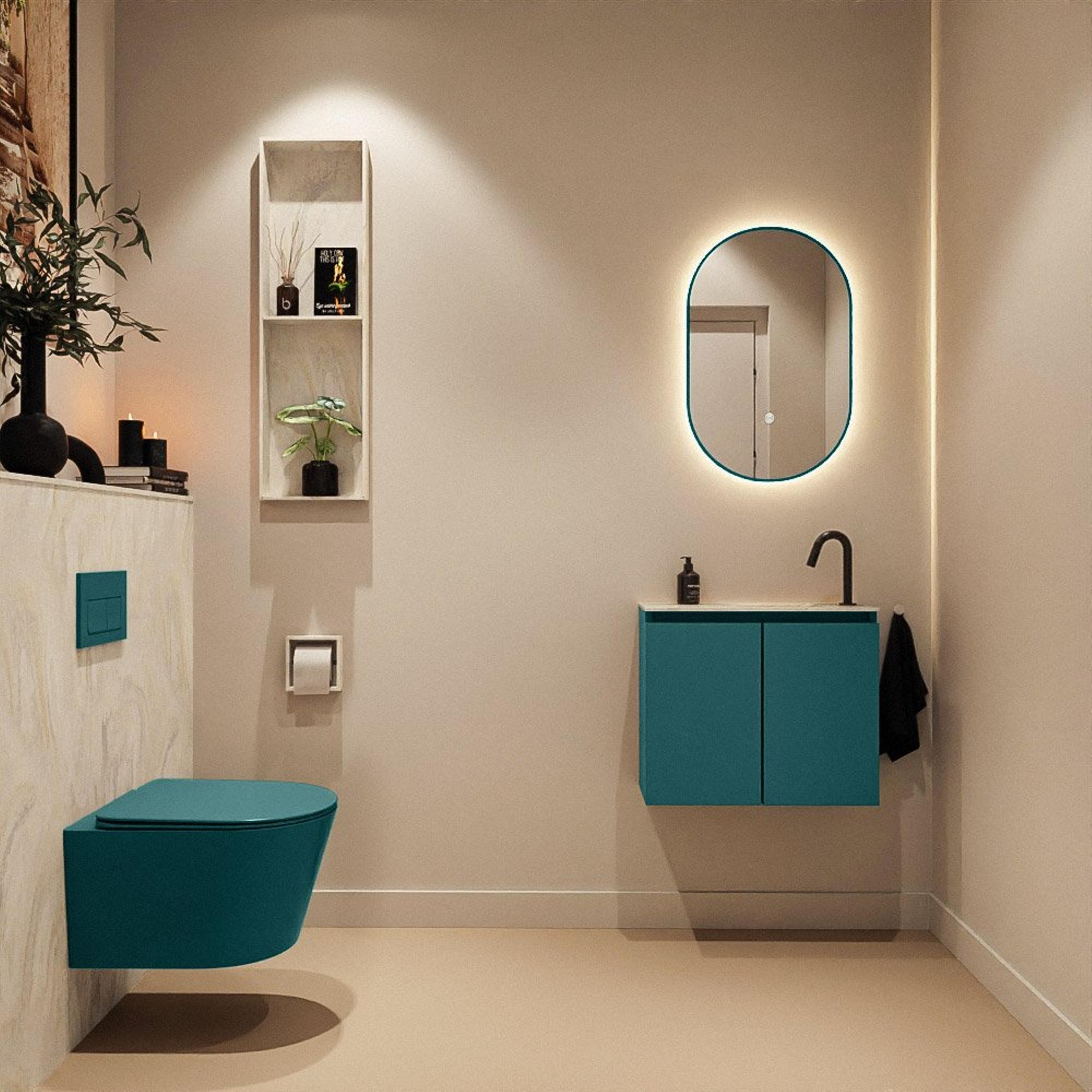 La couleur moderne Smag, une teinte verte raffinée, confère immédiatement à vos toilettes une atmosphère calme et contemporaine. Associée au plan de toilette-lavabo en Solid Surface couleur crème, elle crée un look doux et naturel qui s’accorde parfaitement avec des carreaux clairs, des accents en bois ou des robinets noirs. Le design sans poignées renforce le caractère épuré et minimaliste et évite une surcharge visuelle dans un petit espace. Grâce à cette palette de couleurs neutre mais pleine de caractère, vous pouvez facilement combiner le meuble avec différents styles, du style scandinave clair et aérien au style hôtel-chic avec des accents sombres. Vous créez ainsi, avec un seul meuble, une apparence luxueuse même dans le plus petit espace.