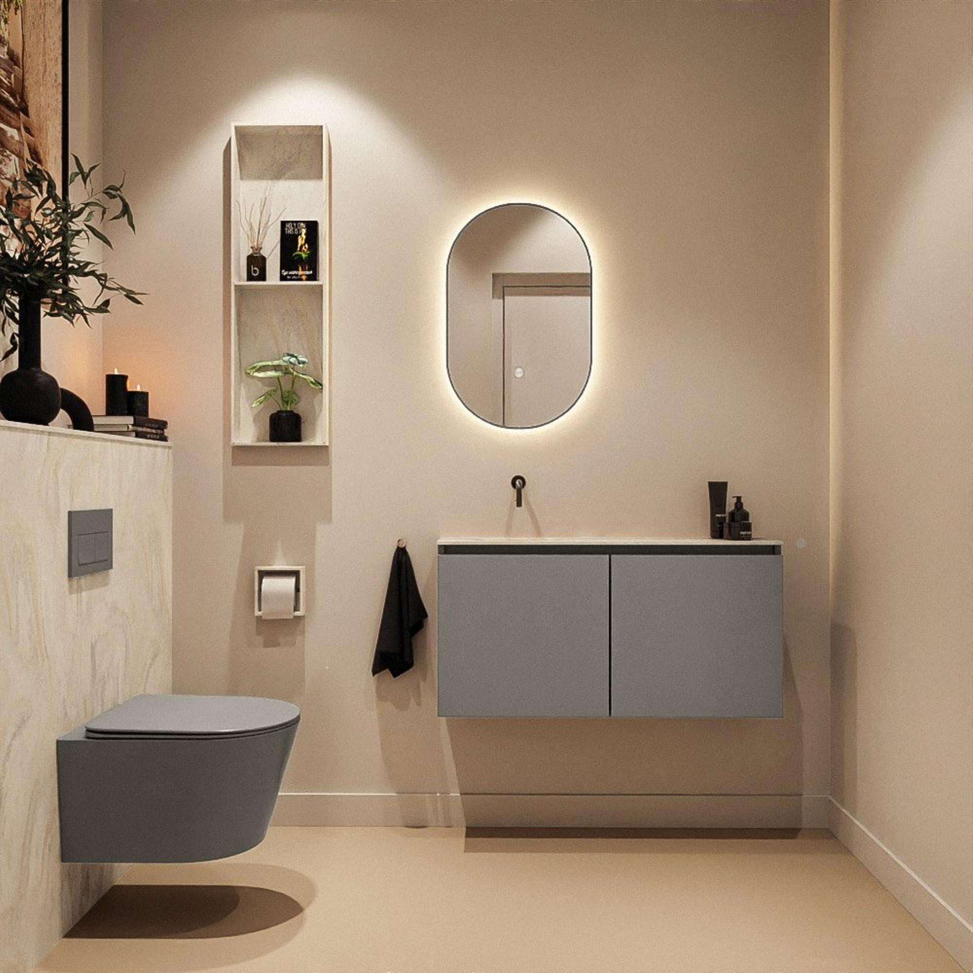 Le meuble de couleur Smoke (anthracite) forme un joli contraste avec le plan vasque crème en solid surface. Cette combinaison a une apparence chaleureuse, luxueuse et pourtant apaisante, ce qui la rend facile à associer avec des carreaux clairs comme foncés. Les façades sans poignées renforcent l’aspect épuré et moderne et rendent l’ensemble intemporel. Grâce à la vasque positionnée à gauche, vous conservez sur le côté droit une surface de dépose pratique pour le savon, une petite serviette ou un accessoire déco. Vous créez ainsi un meuble WC qui n’est pas seulement agréable à regarder, mais aussi judicieusement agencé pour un usage quotidien.