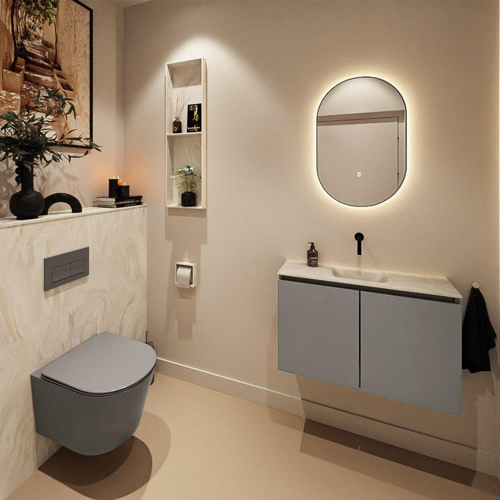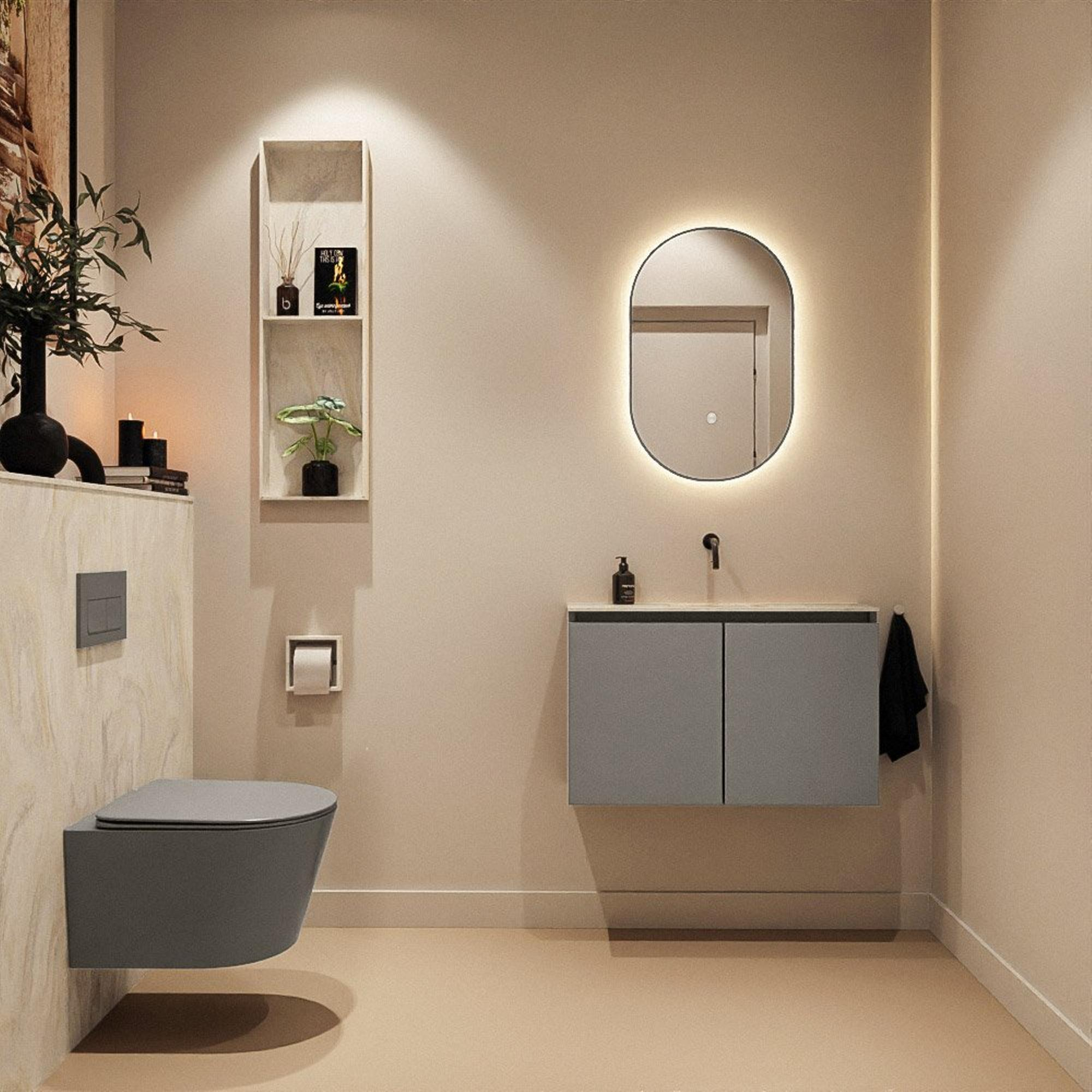 La combinaison du meuble bas couleur Smoke et du lavabo solid surface crème offre un look chic et intemporel qui se marie facilement avec des robinets noirs, chromés ou en laiton et des accessoires assortis. Les portes sans poignées renforcent le design minimaliste et assurent un mur visuellement apaisé, exactement ce que l’on recherche dans un espace compact. Grâce à la position centrale du lavabo, le meuble paraît symétrique et équilibré, ce qui contribue immédiatement à une apparence soignée et moderne. Cela en fait un excellent choix si vous souhaitez ajouter une touche de luxe à vos toilettes, sans que l’ensemble ne paraisse chargé ou encombré.