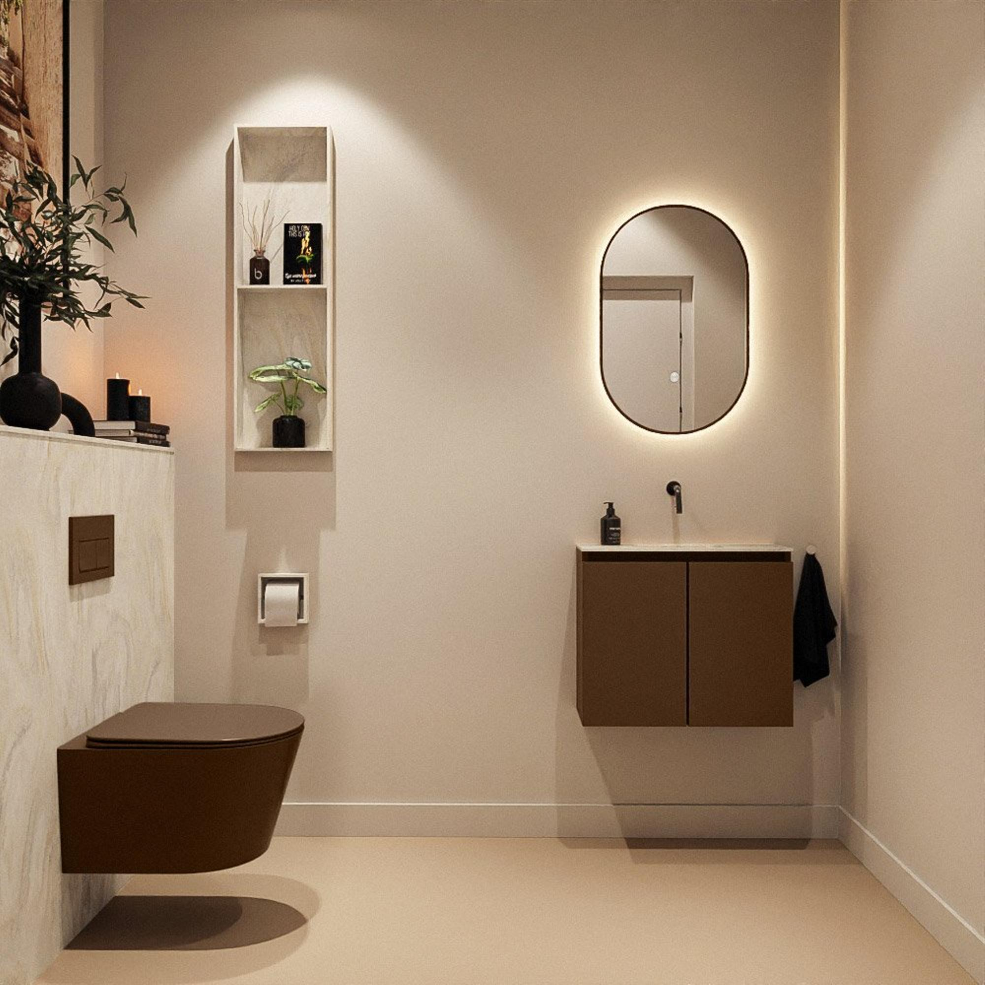 La conception moderne avec façades sans poignées et lignes épurées donne immédiatement à vos toilettes une apparence actuelle et luxueuse. La couleur Rust, une teinte brune chaleureuse, ajoute de l’ambiance et de la profondeur à l’ensemble et se marie bien avec des carreaux blancs, beiges ou au contraire foncés. Le lavabo Eden dans la couleur Ostra est réalisé dans une élégante tonalité crème et forme un contraste chic avec le meuble, ce qui confère à l’ensemble un look à la fois apaisant et particulier. Comme le trou de robinet est absent, le lavabo paraît encore plus épuré et se combine parfaitement avec un mitigeur surélevé séparé sur le plan ou à côté du meuble. Cela rend l’ensemble non seulement esthétiquement attrayant, mais vous aide aussi à prolonger une ligne moderne et cohérente dans le reste de votre salle de bains.