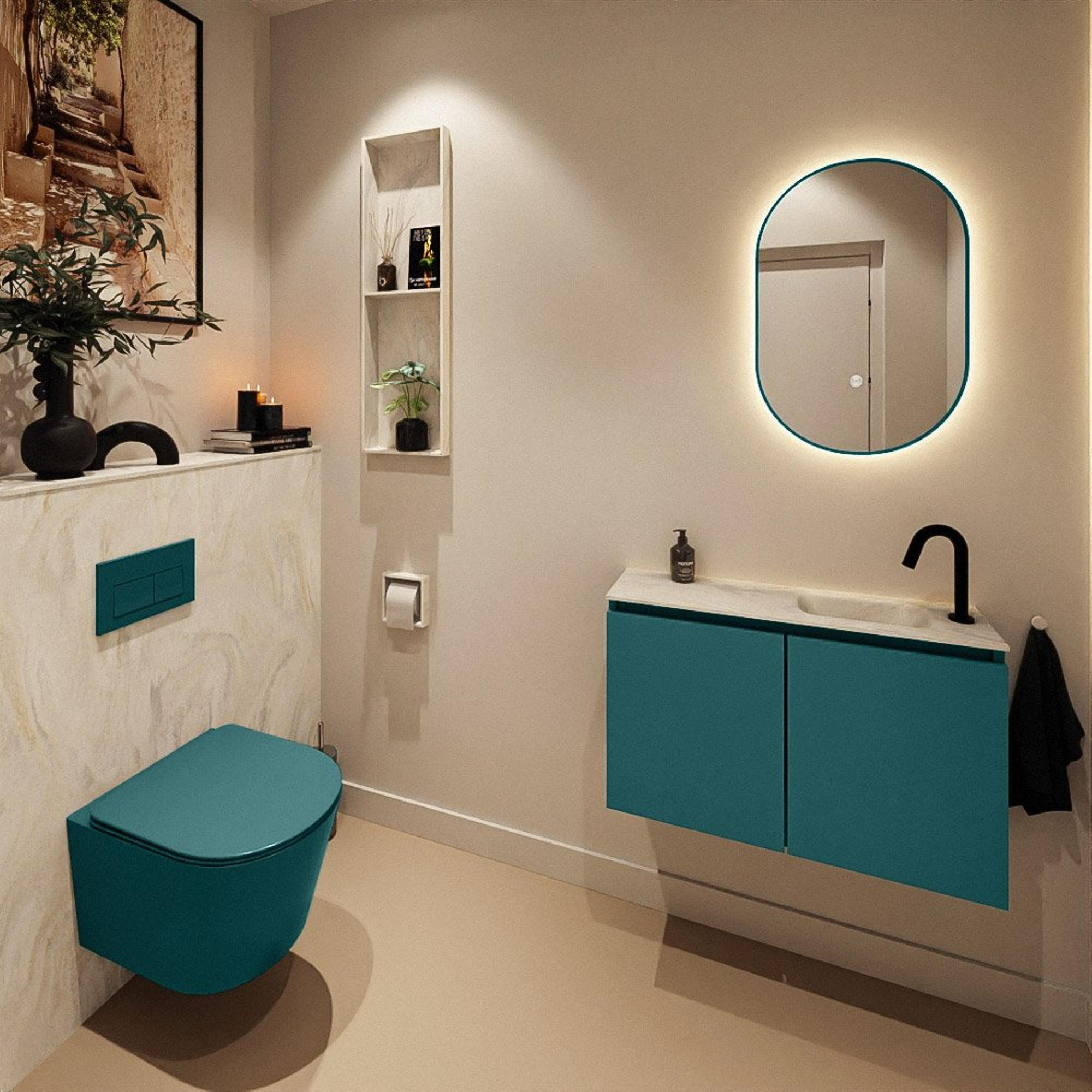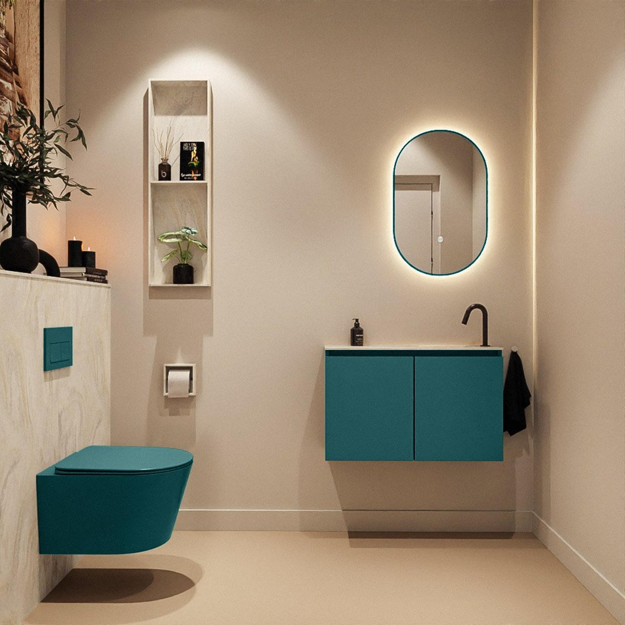 Vous recherchez un meuble de toilettes compact mais luxueux qui donne juste ce petit plus d’allure à vos toilettes ou à votre petite salle de bains, sans prendre trop de place ? Alors cette combinaison avec meuble peu profond et lavabo au design épuré est un choix particulièrement judicieux. Grâce à sa faible profondeur, il s’intègre aisément dans les espaces étroits ou le long d’un mur court, tandis que sa largeur généreuse de 80 cm offre tout de même un véritable plan de lavabo. Les façades modernes, sans poignées, dans une couleur contemporaine, et le doux ton crème du plan de lavabo s’harmonisent parfaitement avec les intérieurs actuels, du style scandinave minimaliste à l’ambiance chic d’hôtel. Idéal si vous souhaitez transformer vos toilettes en une mini-salle de bains complète et élégante, ou si vous cherchez, dans une petite salle de bains, une solution fine qui ait une apparence haut de gamme tout en restant pratique au quotidien.