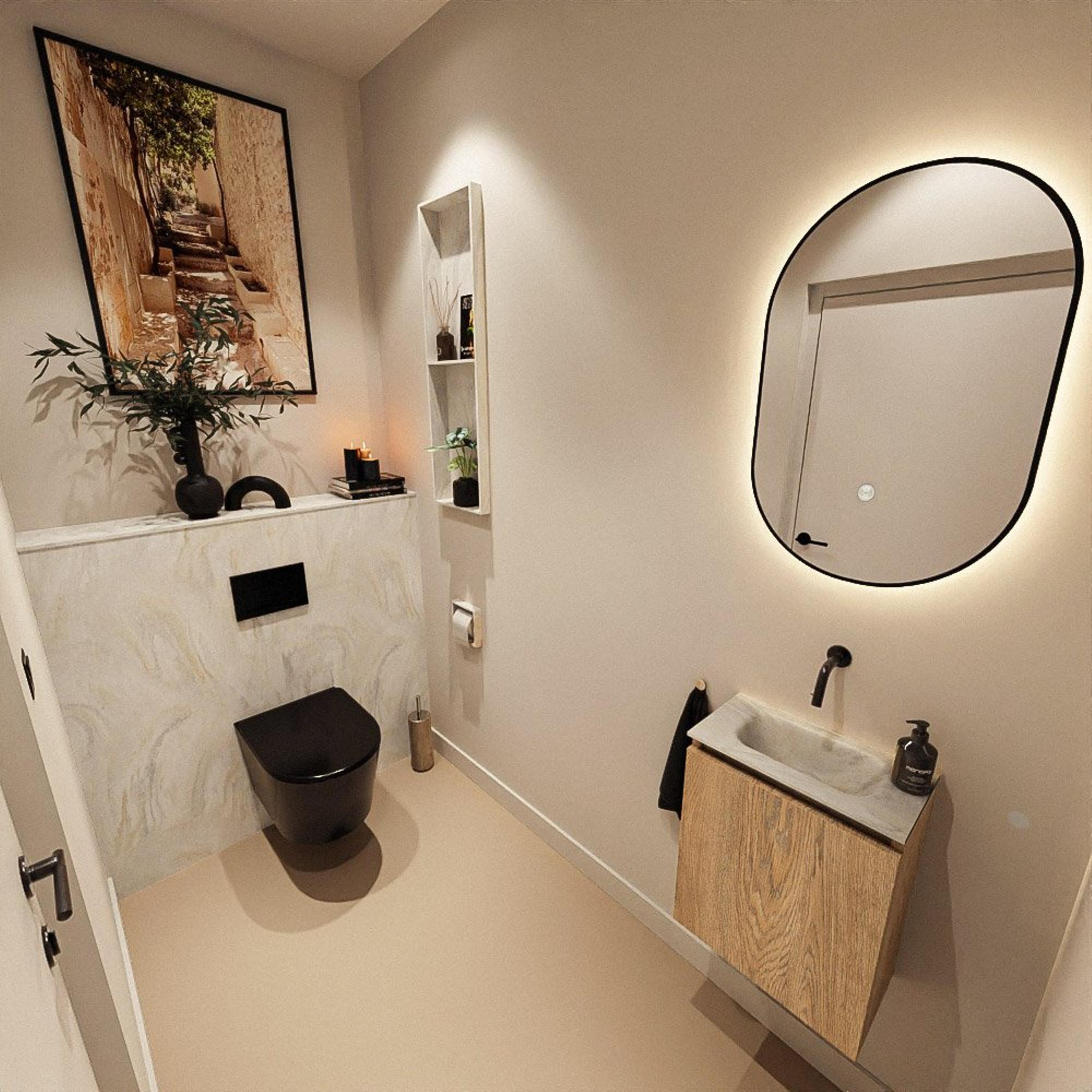 La couleur Washed Oak donne immédiatement à vos toilettes une atmosphère chaleureuse et naturelle, tandis que le lavabo moderne en solid surface dans la teinte Ostra/crème apporte une touche fraîche et contemporaine. Cette combinaison s’harmonise parfaitement avec les styles de salle de bains populaires tels que scandinave, moderne et hôtel chic. Les façades sans poignées offrent une vue d’ensemble calme, sans surcharge visuelle, ce qui met davantage en valeur les accessoires et le carrelage. Avec un seul meuble compact, vous apportez ainsi directement un ensemble complet et élégant chez vous.