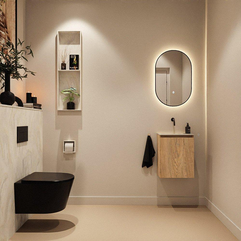 Avec une largeur de 40 cm et une profondeur de seulement 23 cm, ce meuble WC est spécialement conçu pour les espaces compacts, comme des toilettes invités ou une petite salle de bains. Le meuble peu profond dépasse très peu, ce qui vous permet de conserver davantage d’espace de mouvement et de faire paraître la pièce visuellement plus grande. Le lavabo placé au centre offre un confort de lavage suffisant sans que le meuble paraisse massif. Vous combinez ainsi fonctionnalité et lignes épurées, idéal si vous souhaitez créer un espace WC minimaliste ou moderne.
