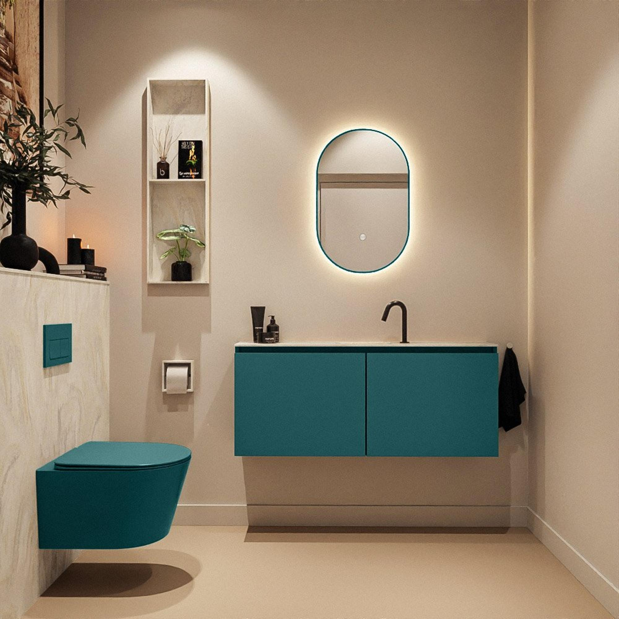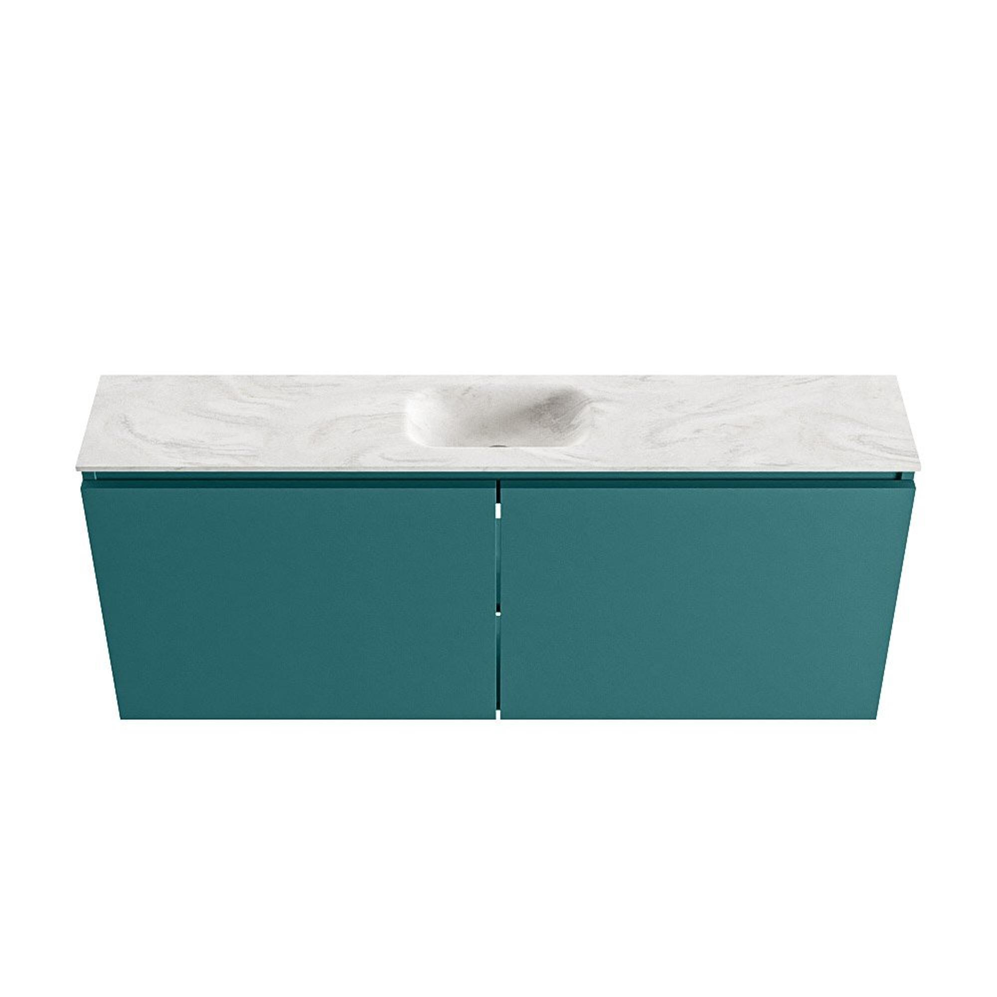 Avec une largeur de 120 cm et une profondeur extra réduite de seulement 23 cm, vous obtenez une apparence généreuse sans que le meuble n’occupe trop d’espace. La couleur Smag - une teinte verte moderne - donne immédiatement de l’atmosphère et du caractère à vos toilettes, surtout en combinaison avec des carreaux neutres ou un béton ciré sobre. Les façades sans poignées assurent un ensemble épuré et minimaliste sans pollution visuelle, ce qui fait paraître la pièce plus grande et plus calme. Les portes à fermeture douce (softclose) se ferment délicatement et sans bruit, ce qui ne donne pas seulement une sensation de luxe, mais évite également une usure inutile. Grâce au positionnement symétrique du lavabo au centre, vous disposez à gauche et à droite d’une agréable surface de dépose pour le savon, un diffuseur de parfum ou de petits accessoires, afin que vos toilettes aient toujours un aspect soigné.