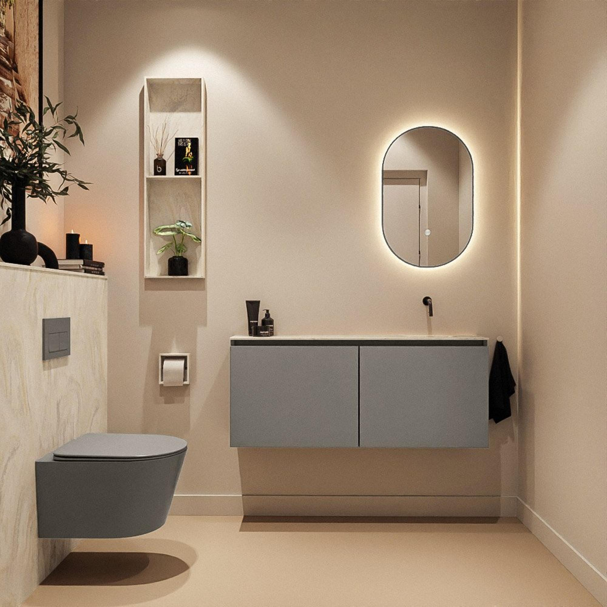 La couleur foncée Smoke du meuble, combinée au lavabo crème en solid surface, crée un look élégant et contemporain. Cette combinaison de couleurs se marie facilement avec des robinets et accessoires noirs, chromés ou en laiton, afin que vous puissiez prolonger le style de vos toilettes dans les moindres détails. La façade sans poignées renforce le design épuré et moderne et évite la surcharge visuelle sur un mur relativement petit. Ainsi, ce meuble s’accorde parfaitement avec des carrelages modernes, un effet béton ou des teintes naturelles et sobres, et vous créez des toilettes qui donnent l’impression d’un mini espace bien-être.