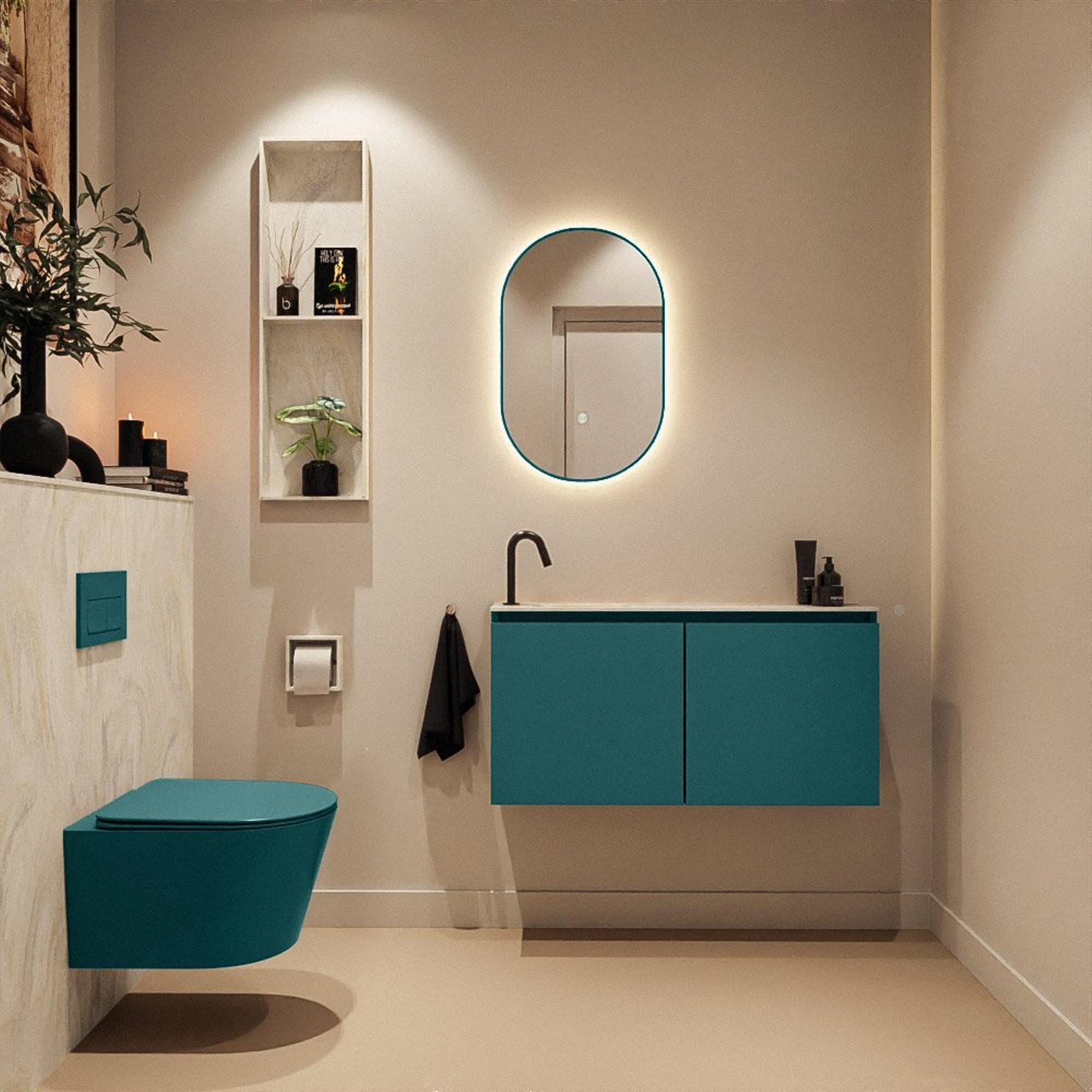 Le meuble est réalisé en MDF dans la couleur moderne Smag, une teinte de vert contemporaine qui donne à votre espace WC une apparence calme et raffinée. Le plan de lavabo en solid surface dans un doux ton crème forme un beau contraste et met encore plus en valeur votre robinet. Cette combinaison de teintes chaudes et apaisantes s’accorde parfaitement avec les tendances actuelles de salle de bains et se marie très bien avec des robinets et accessoires noirs, en inox ou aspect chrome. Grâce aux lignes épurées et au style moderne, vous créez facilement une ambiance d’hôtel de luxe, même dans un petit WC ou une salle de bains compacte.