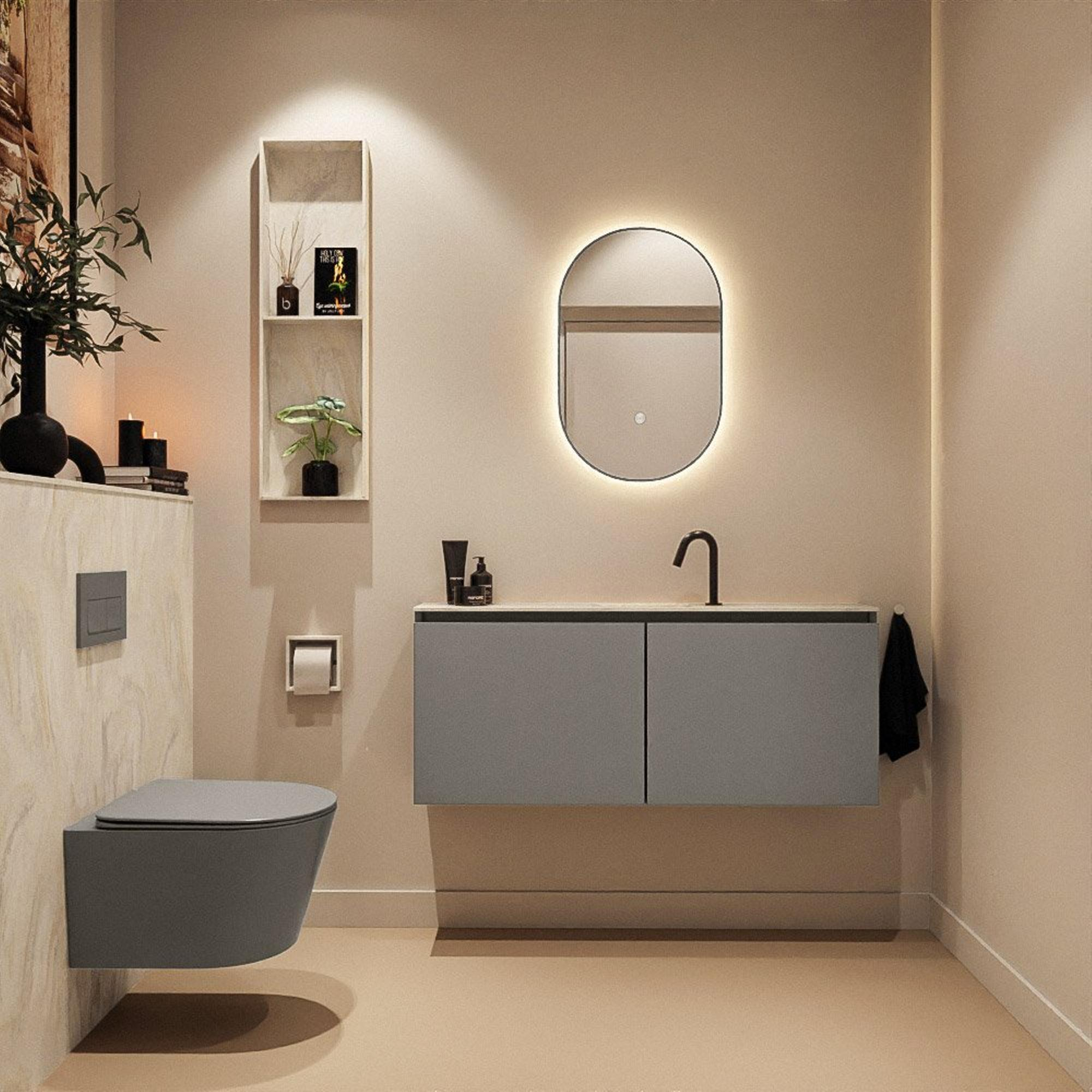 La combinaison de la couleur Smoke du meuble avec le lavabo Eden dans la teinte crème chaude Ostra crée une atmosphère chic digne d’un hôtel. Le plan doux et clair en solid surface se détache subtilement du corps foncé, donnant immédiatement plus de profondeur et de caractère à vos toilettes. Grâce au trou de robinet au centre, vous pouvez facilement choisir un beau mitigeur de lavabo à poser ou sur gorge, exactement dans le style du reste de votre salle de bains. La disposition symétrique avec le lavabo au milieu offre un rendu apaisant et rend le meuble adapté aussi bien aux petites familles qu’aux WC d’appoint très fréquentés. Grâce aux lignes modernes, ce meuble WC se combine aisément avec des accents noirs, des détails en inox ou encore des robinets chromés intemporels.