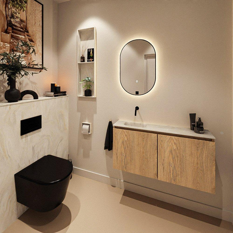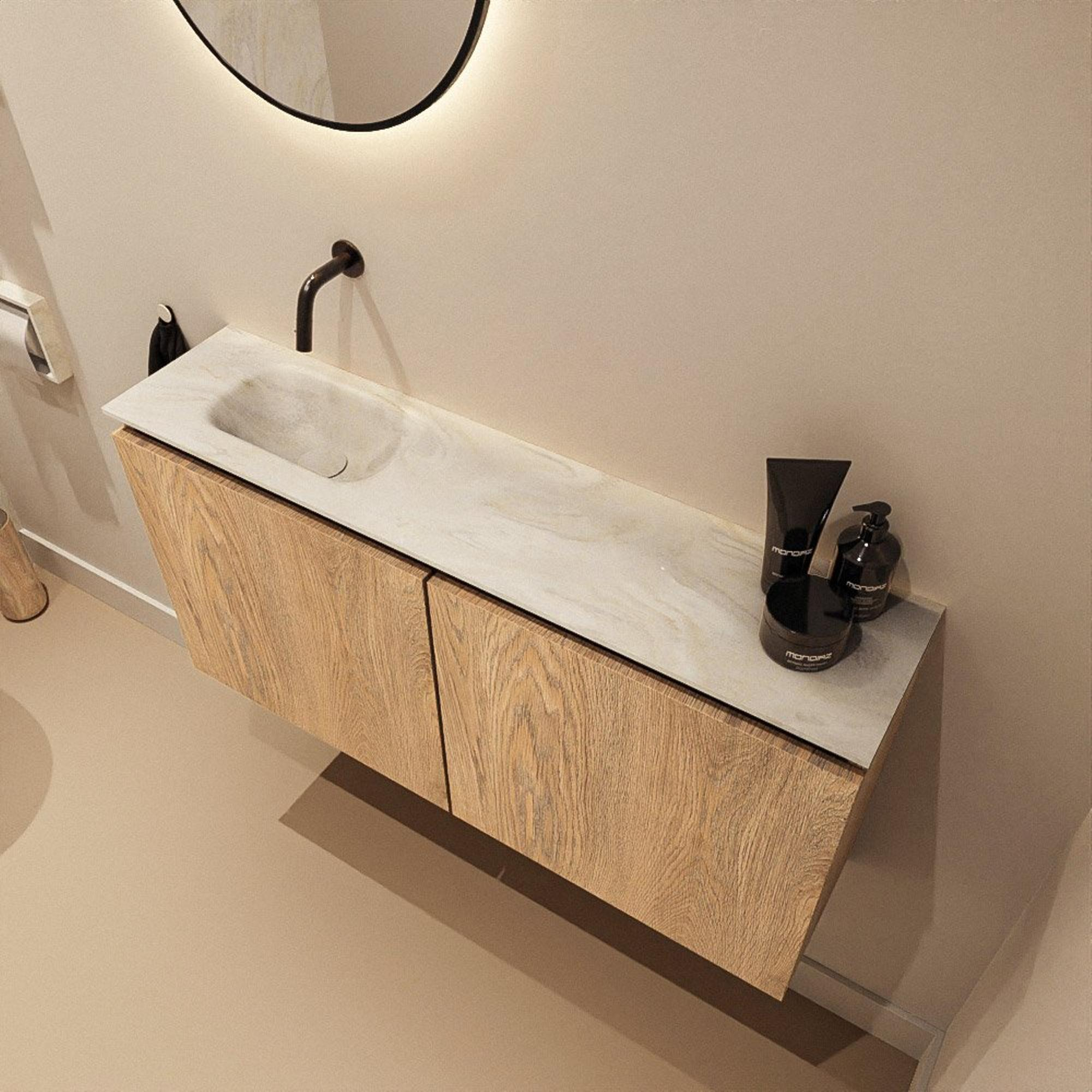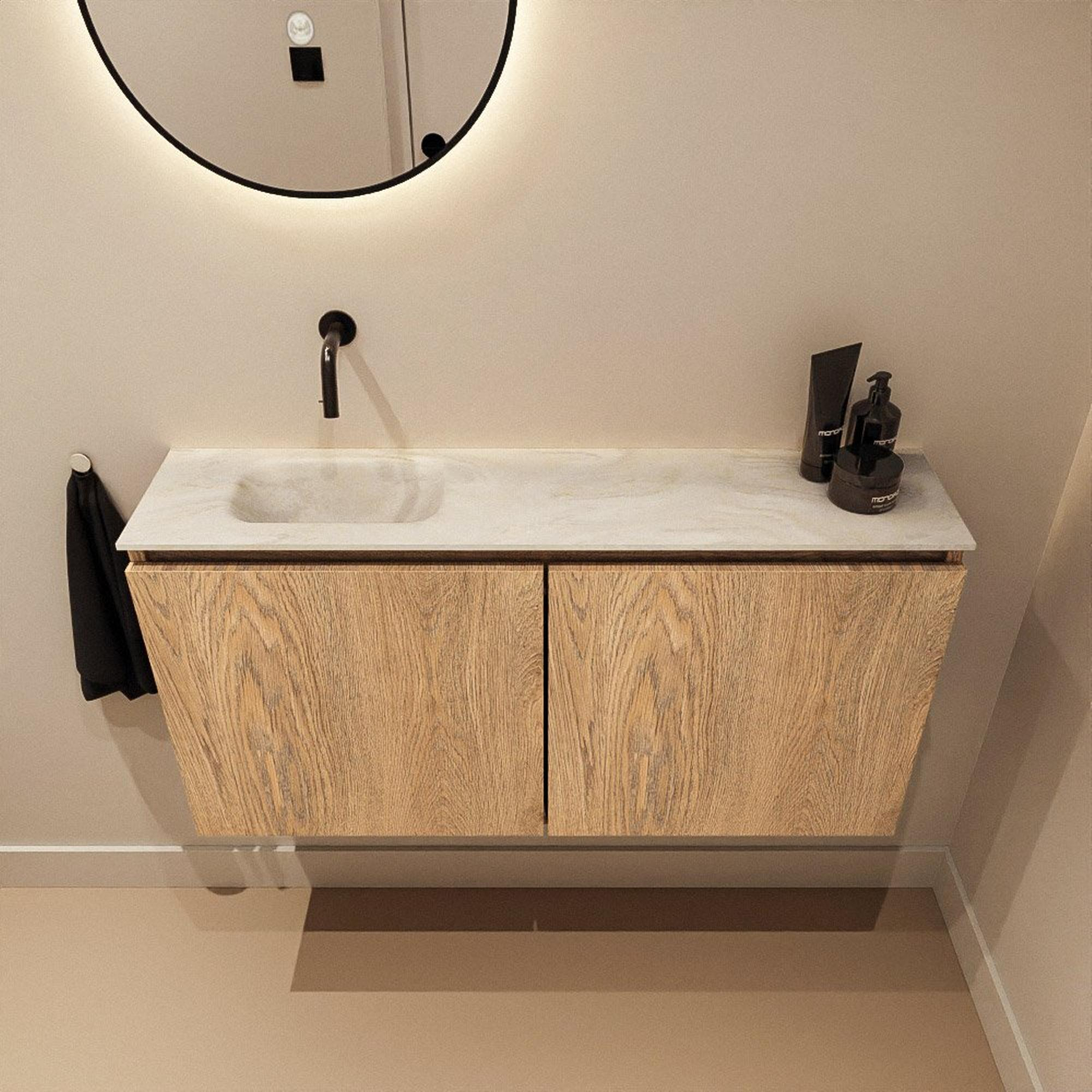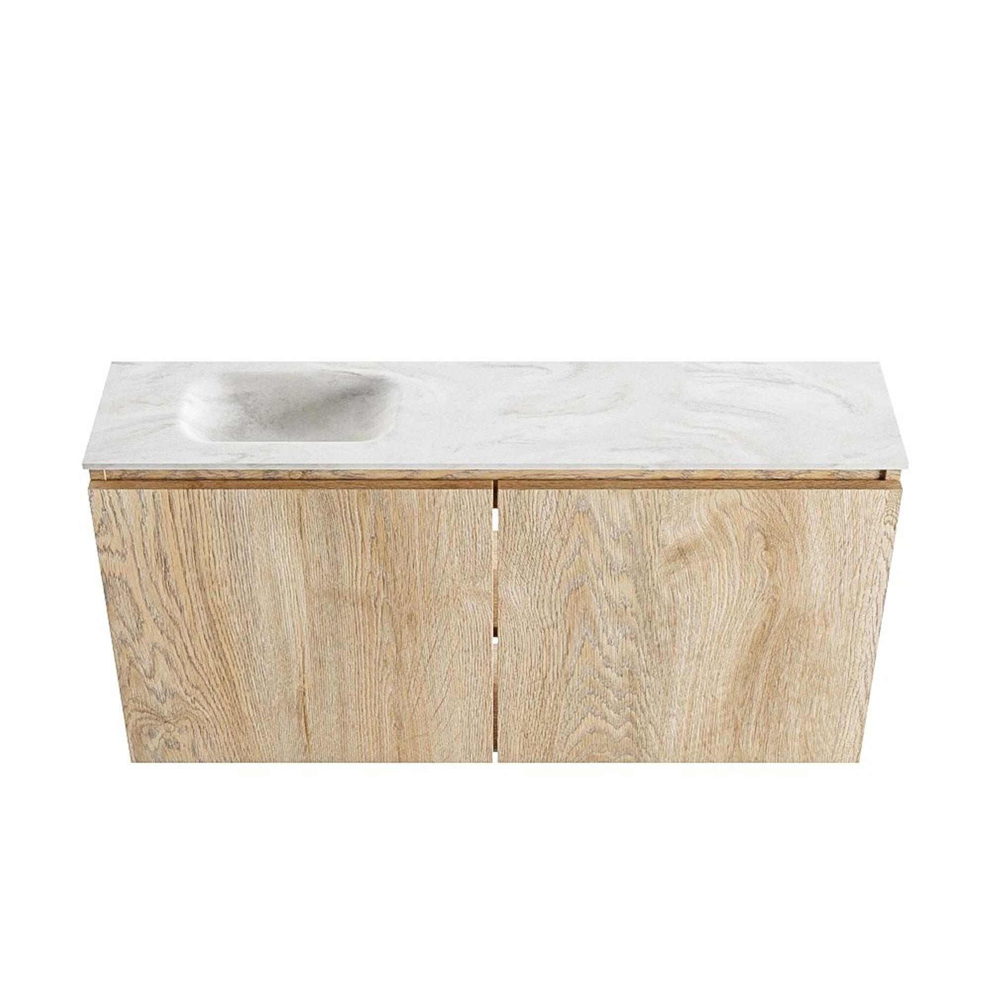 MONDIAZ TURE-DLUX meuble de toilettes 100cm Chêne blanchi. EDEN lavabo Ostra position gauche. Sans trou de robinet.