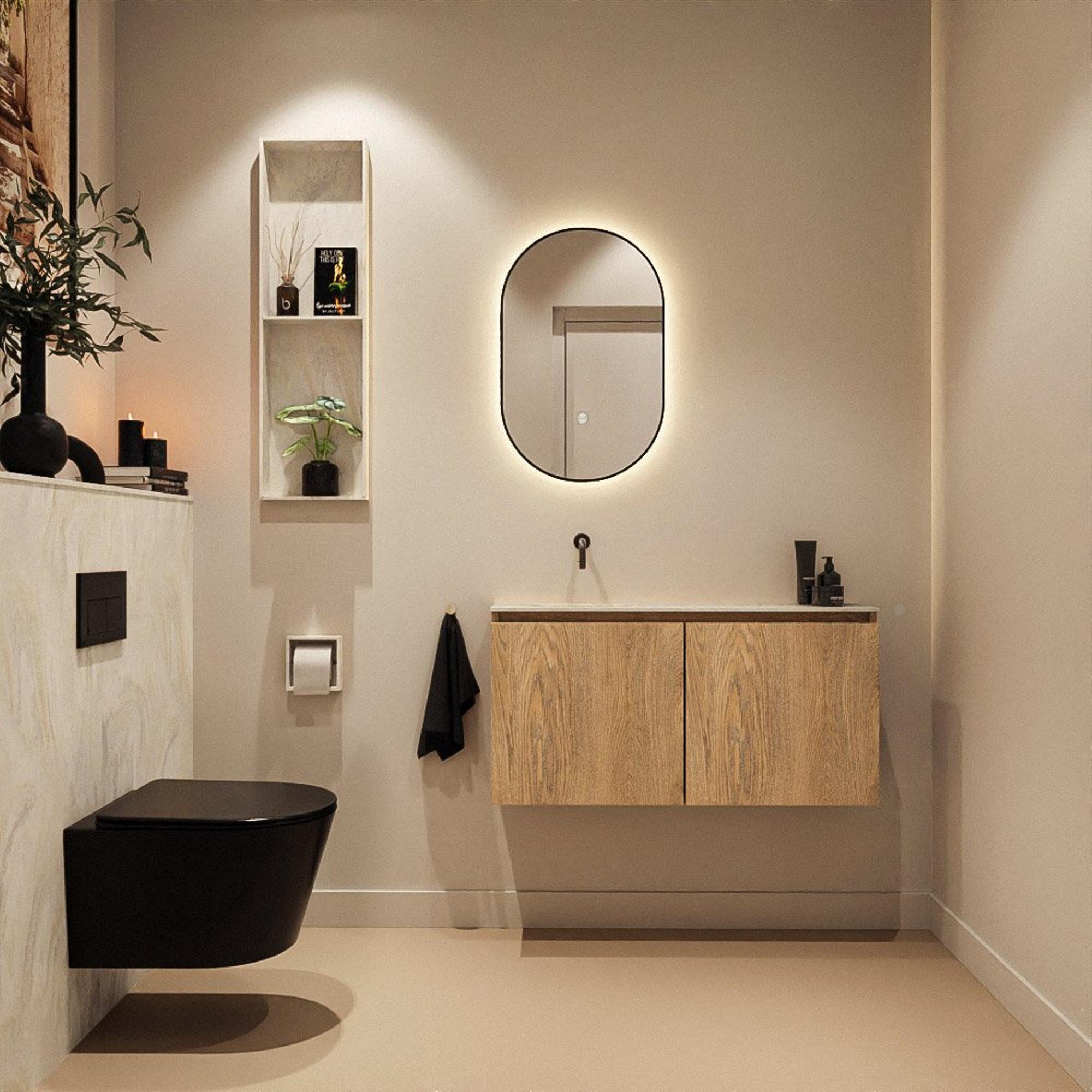 Avec une largeur de 100 cm et une profondeur de seulement 23 cm, vous optimisez l'espace disponible sans que le meuble n'empiète sur le passage. Le lavabo se trouve à gauche, ce qui vous laisse à droite un plan de toilette dégagé et harmonieux pour, par exemple, un distributeur de savon ou un accessoire décoratif. Les deux portes offrent un espace de rangement surprenant pour les rouleaux de papier toilette, les produits d'entretien et les serviettes invité, de sorte que tout reste bien hors de vue. Les façades sans poignées renforcent le look moderne et épuré et veillent en plus à ce que vous ne vous cogniez nulle part dans un espace réduit.