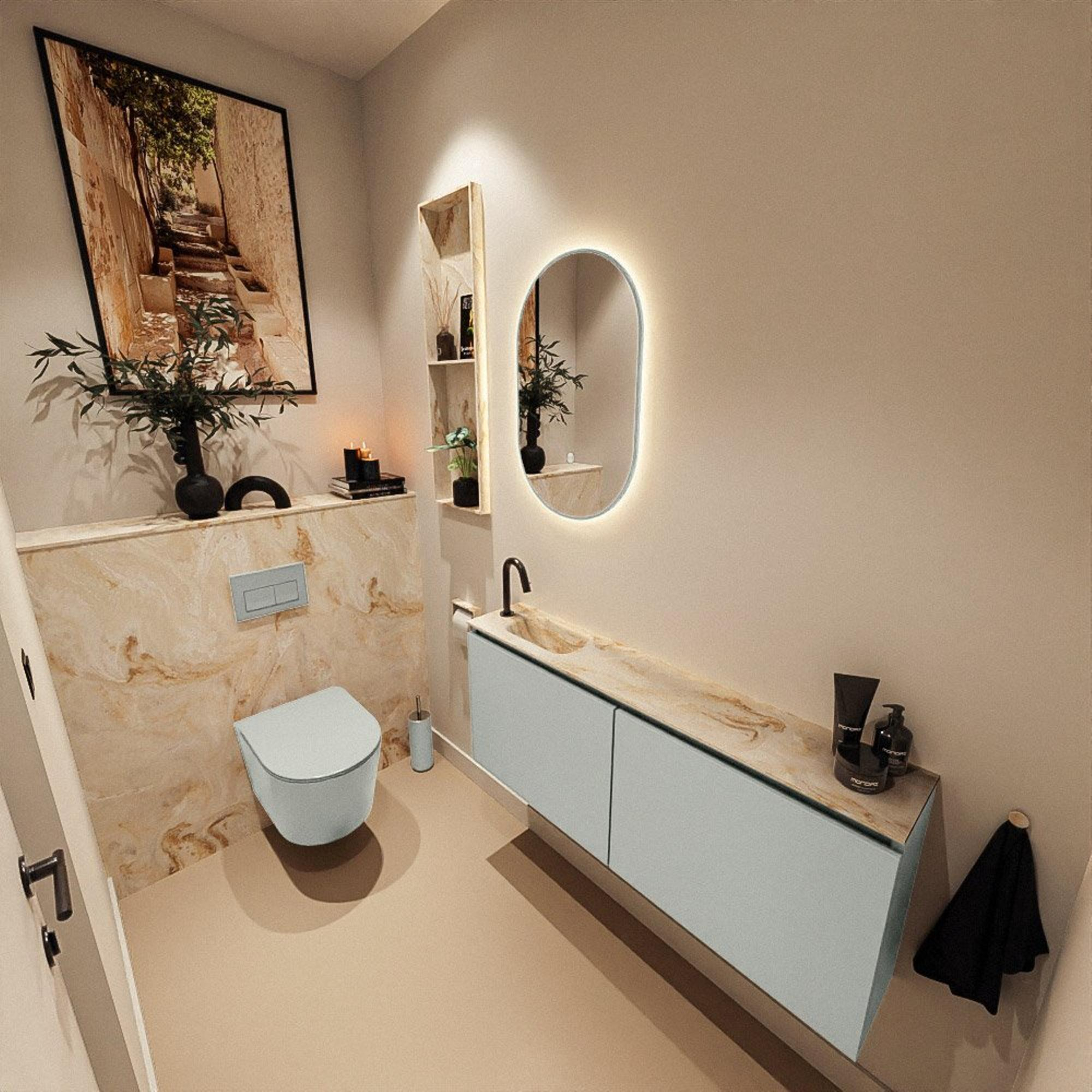 La combinaison de la couleur Greey pour le meuble et du lavabo Eden en Frappe crée un contraste de couleurs subtil et sophistiqué. Le gris doux a un effet apaisant et se marie facilement avec des carreaux muraux blancs, un aspect béton ou au contraire des tons bois chauds. Le lavabo beige apporte de la chaleur et évite que la pièce paraisse froide, ce qui fait particulièrement la différence en termes d’ambiance dans des toilettes ou une petite salle de bains. Cette combinaison de couleurs moderne est idéale si vous recherchez une atmosphère chic façon hôtel, mais aussi si vous souhaitez une base calme avec laquelle vous pourrez facilement jouer plus tard grâce aux accessoires. Vous créez ainsi une base intemporelle qui restera belle pendant des années, même lorsque vous ferez évoluer votre style ou vos couleurs d’accent.