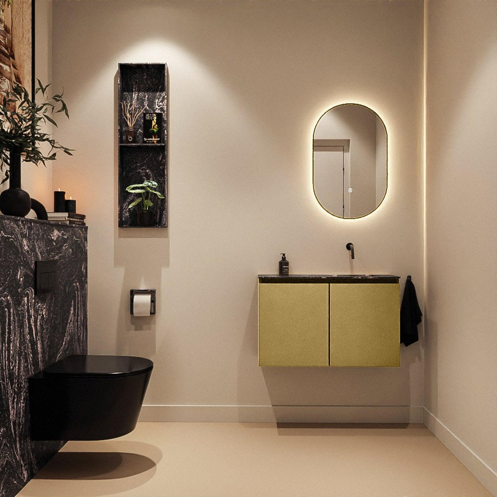La finition dorée Oro du meuble, combinée au lavabo foncé Eden en Lava, crée une apparence puissante et moderne. Cette combinaison de couleurs s’accorde parfaitement avec les salles de bains tendance dotées d’accents noirs, de carreaux effet marbre ou de teintes béton chaleureuses. Grâce au design sans poignées, la façade paraît particulièrement épurée et calme, ce qui renforce la sensation de luxe. Le lavabo est réalisé sans trou de robinet, ce qui vous laisse une totale liberté pour choisir un mitigeur surélevé mural ou posé sur le plan. Vous adaptez ainsi parfaitement le meuble au reste de votre sanitaire et créez un ensemble harmonieux. Cela en fait un excellent choix si vous souhaitez aménager un espace WC moderne et axé sur le design.