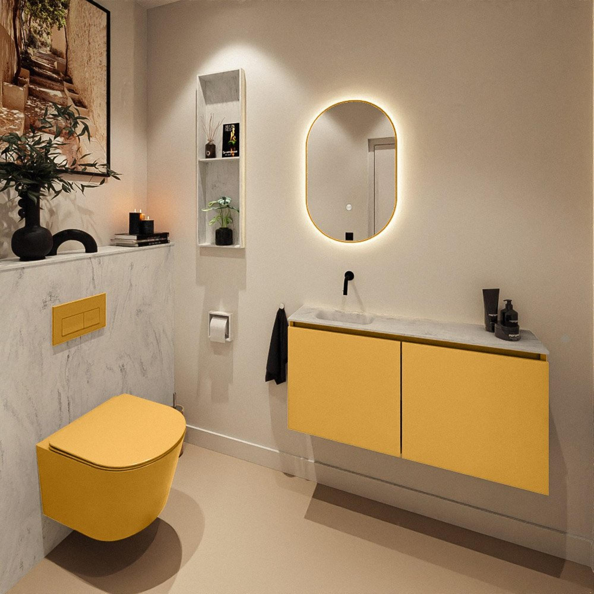 La couleur ocre du meuble donne immédiatement du caractère à vos toilettes ou votre salle de bains : chaleureuse, contemporaine et un peu différente du blanc ou du gris standard. Combinée au lavabo Eden gris, elle crée un contraste moderne qui se marie bien avec des robinets noirs, des accessoires mats et des carreaux effet bois ou béton. Les façades sans poignées renforcent le jeu de lignes minimaliste et assurent un ensemble sobre et épuré. Cela rend le meuble parfaitement adapté aux intérieurs modernes et axés design, mais aussi à ceux qui souhaitent instaurer une ambiance d’hôtel de luxe dans un espace compact. Vous créez ainsi, avec relativement peu d’éléments, une apparence haut de gamme et bien pensée.