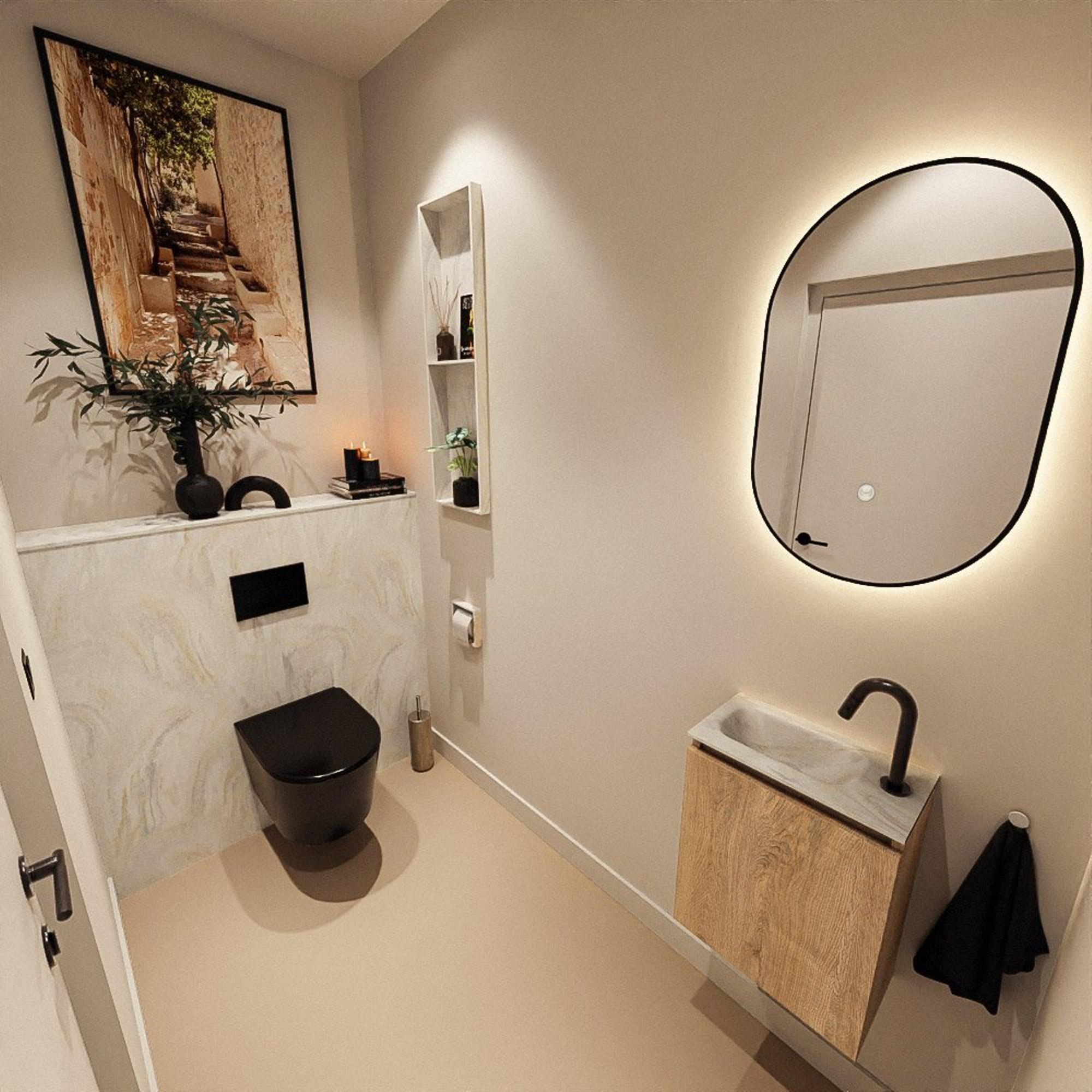La couleur Washed Oak donne à vos toilettes une apparence chaleureuse et naturelle avec une touche moderne. La structure du bois crée un look chic et contemporain, tandis que les lignes épurées et les façades sans poignées s’intègrent parfaitement dans une salle de bains minimaliste ou moderne. La combinaison avec le plan vasque en Solid Surface crème forme un ensemble calme et harmonieux qui s’accorde aussi bien avec des carreaux clairs que foncés. Grâce à la teinte bois subtile, vous pouvez facilement accessoiriser ce meuble avec des robinets et accessoires noirs, chromés ou en métal brossé, afin de créer en un rien de temps une ambiance cohérente et haut de gamme.