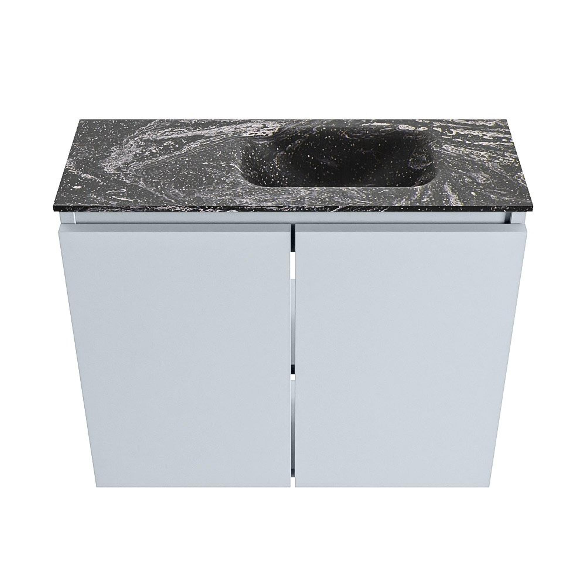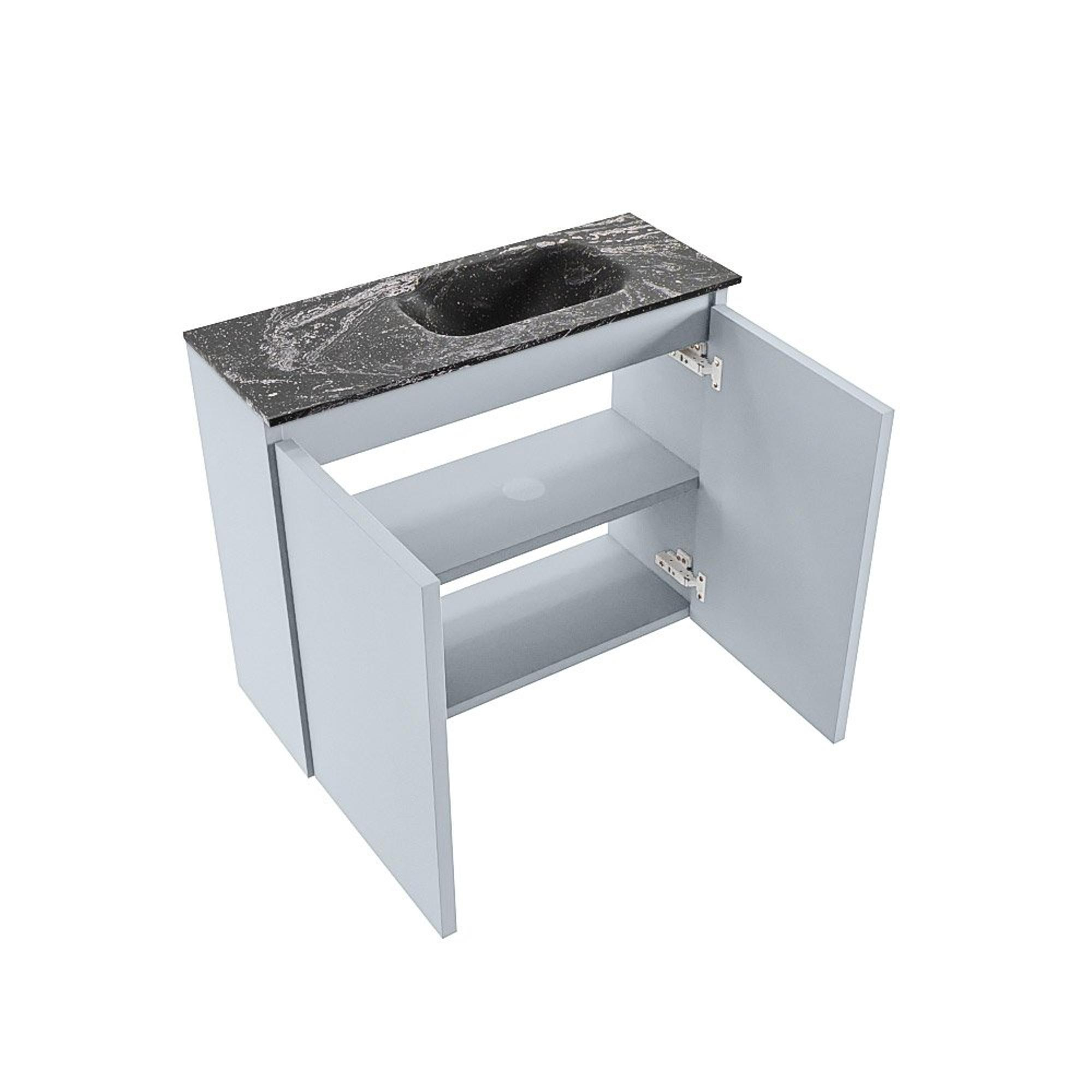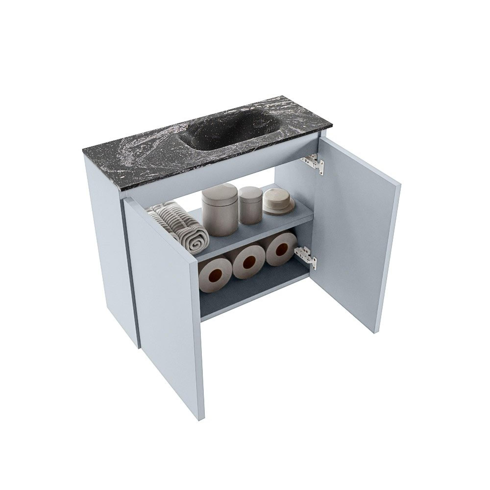 Ce set compact et moderne est idéal si vous souhaitez une solution de lavabo complète dans une petite salle de bains, un espace toilettes ou une niche étroite. La combinaison d'un meuble peu profond et d'un lavabo astucieusement façonné vous offre suffisamment d'espace de lavage sans rétrécir le passage. Grâce à la couleur grise apaisante, ce meuble s'intègre parfaitement dans des intérieurs minimalistes, modernes et scandinaves, mais aussi dans un style plus chaleureux, hôtel-chic avec des accents foncés. Le lavabo avec trou de robinet à droite est particulièrement pratique lorsque l'arrivée d'eau ou l'espace disponible l'exige, par exemple à côté d'un WC ou dans un couloir étroit. Si vous recherchez un meuble de toilettes élégant, fonctionnel et gain de place qui restera soigné même après des années, cet ensemble est un choix particulièrement judicieux.