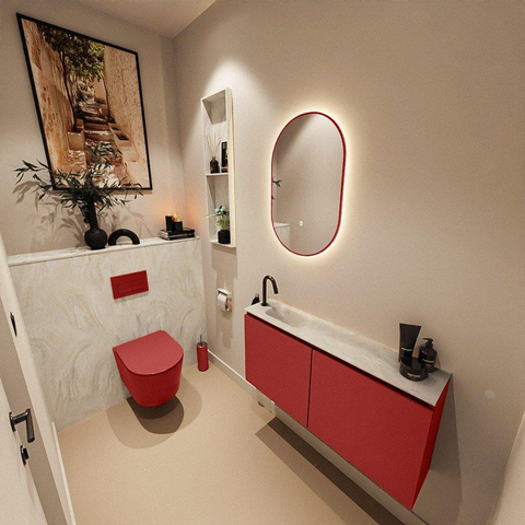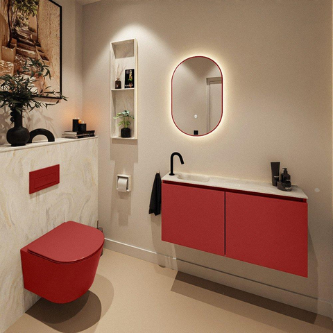 La couleur de base Fire est une teinte de rouge moderne qui donne immédiatement plus de caractère à vos toilettes. Elle paraît chaleureuse et contemporaine, surtout en combinaison avec des carreaux neutres ou un sol sobre. Le lavabo EDEN couleur crème en solid surface forme un contraste doux et apporte de l’équilibre à l’ensemble. Ainsi, cet ensemble s’intègre aussi bien dans un style moderne et minimaliste que dans une salle de bains de style hôtel chic ou design. La finition sans poignées renforce le jeu de lignes épurées et évite la surcharge visuelle, ce qui fait une grande différence surtout dans les petits espaces. Avec cette combinaison, vous créez sans effort un look luxueux qui ne manquera pas de se faire remarquer par vos invités.