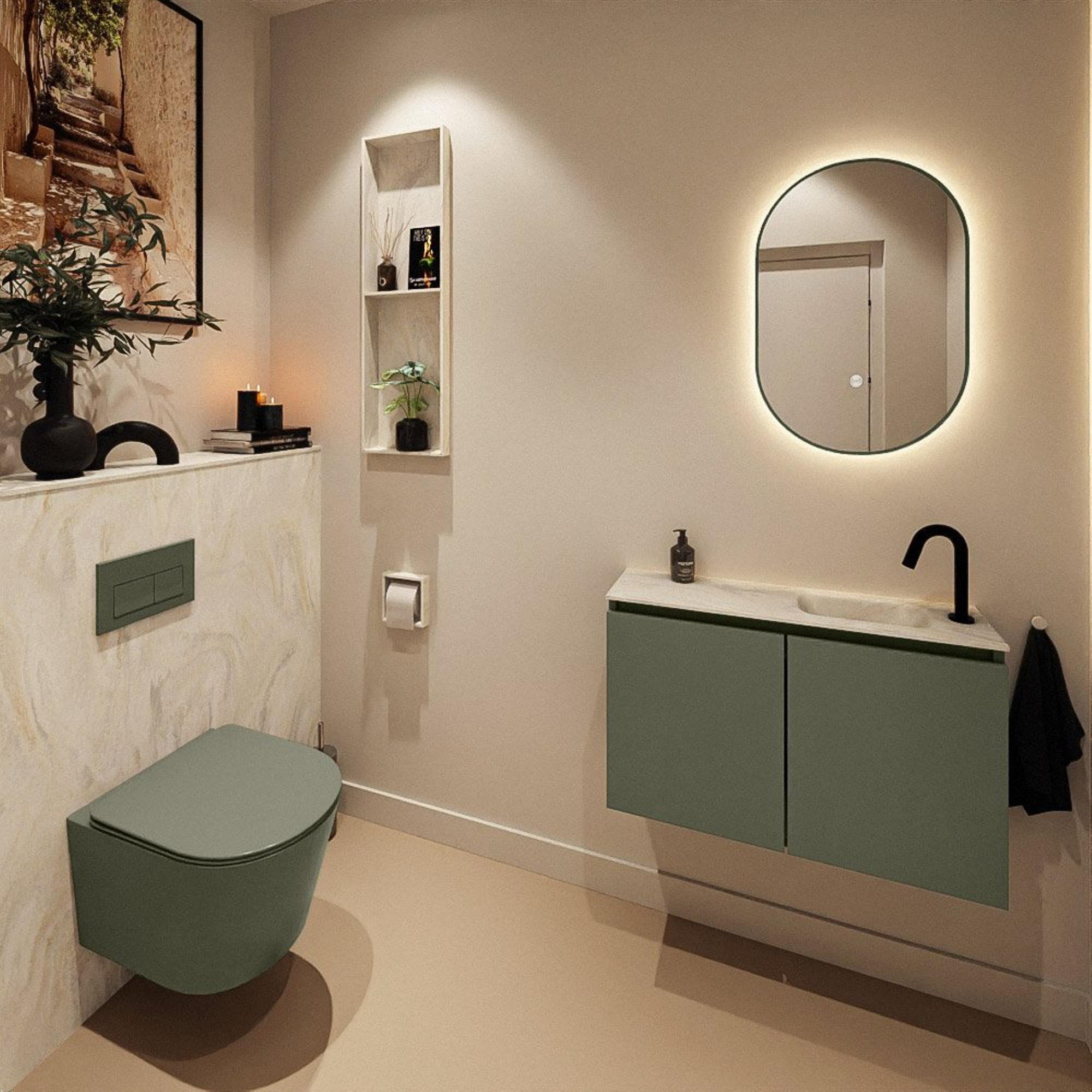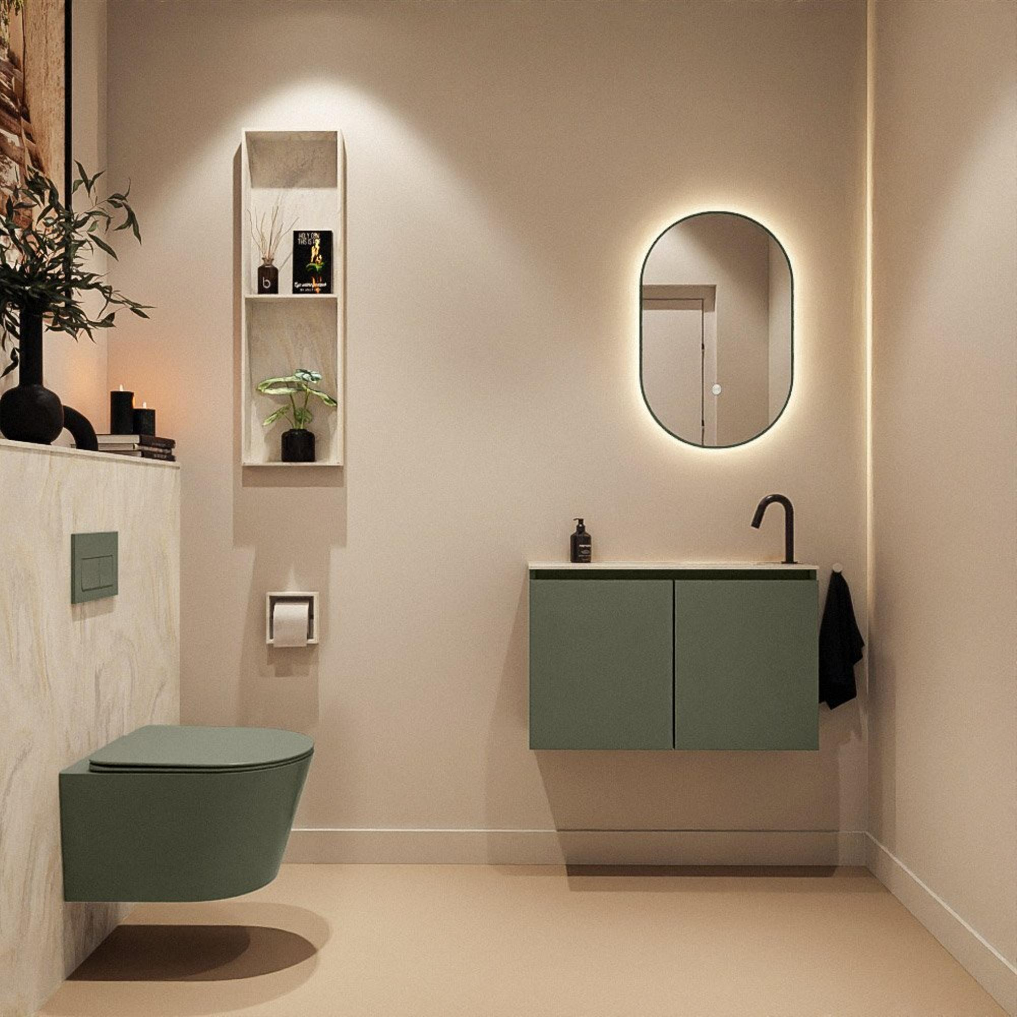 La couleur moderne Army confère au meuble un aspect robuste et contemporain qui s’accorde très bien avec des carreaux effet béton, des accents bois et des robinets noirs ou laiton. Le lavabo crème en solid surface dans la version Ostra y ajoute une touche douce et luxueuse, comme si un léger accent marbré était intégré à vos toilettes. Cette combinaison de vert et de crème apporte à la fois calme et chaleur, de sorte que les petits espaces paraissent moins cliniques. La finition sans poignées des deux portes souligne le caractère minimaliste et fait de la face avant un seul panneau uniforme. Vous créez ainsi facilement un statement de design haut de gamme, sans devoir combiner plusieurs meubles de salle de bains ni chercher vous‑même des styles assortis.