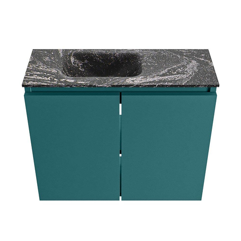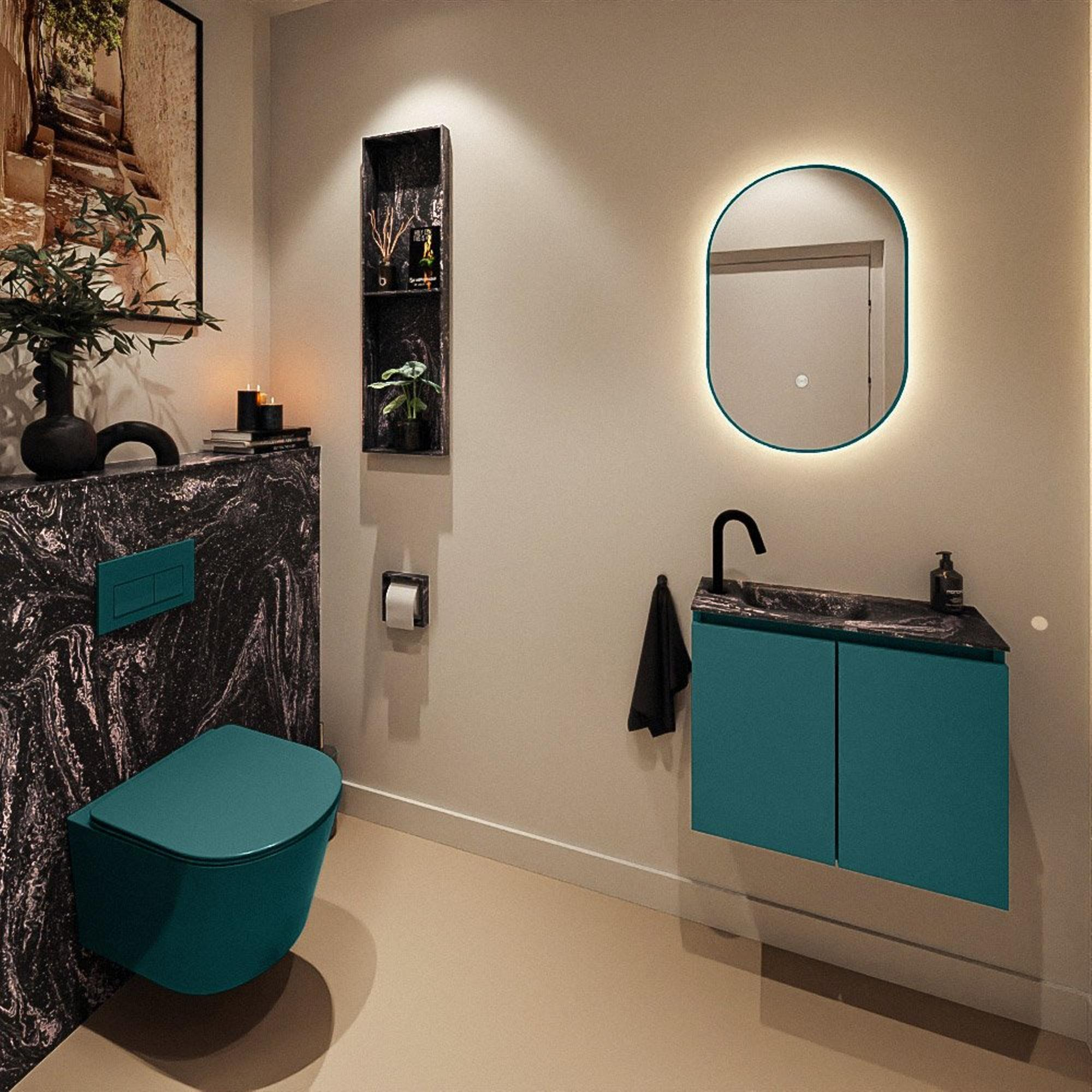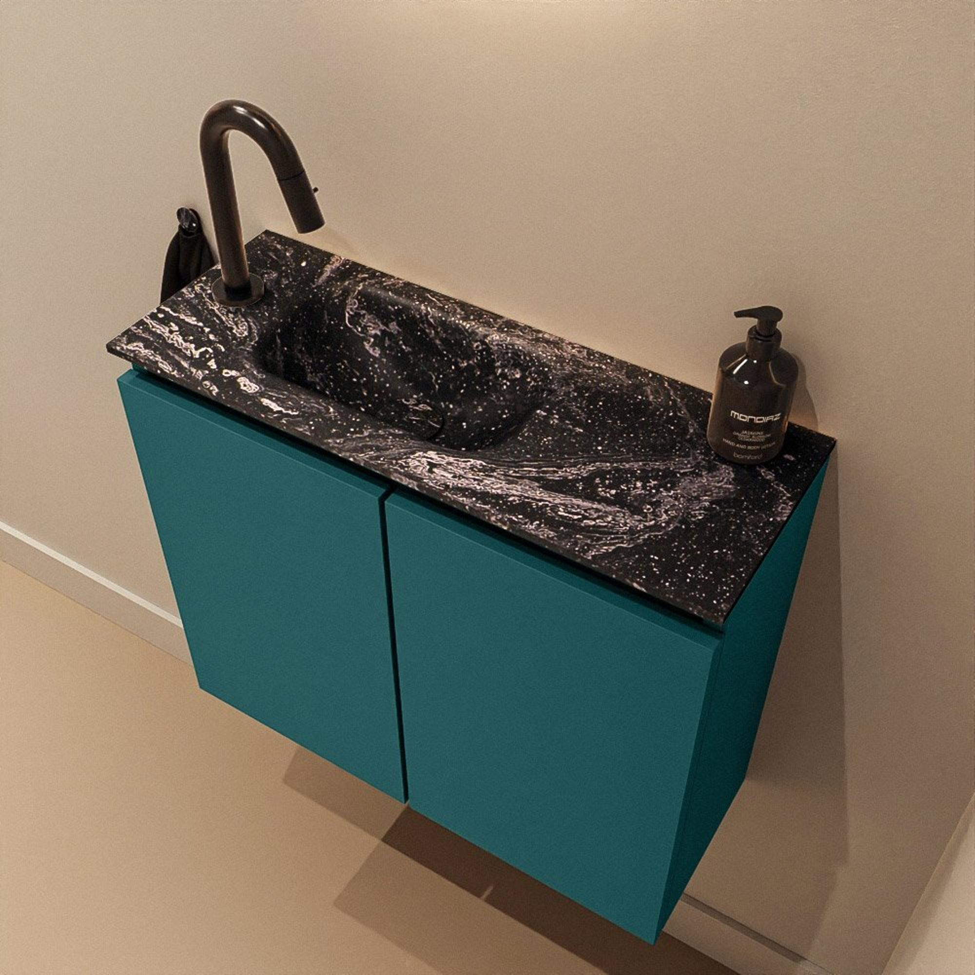 Le meuble est réalisé dans la couleur Smag, une teinte de vert moderne avec un look élégant et contemporain qui se marie à merveille avec des carreaux clairs comme avec des murs foncés. En combinaison avec le plan de lavabo en Solid Surface noir dans la couleur Lava, il crée un contraste chic qui donne immédiatement du caractère à vos toilettes. Les façades sans poignées assurent une apparence épurée et minimaliste sans interruptions, idéal si vous aimez un intérieur moderne ou design. Cela permet également de combiner facilement le meuble avec des robinets noirs, des accessoires et, par exemple, un miroir noir ou des détails en noir mat pour un ensemble harmonieux.