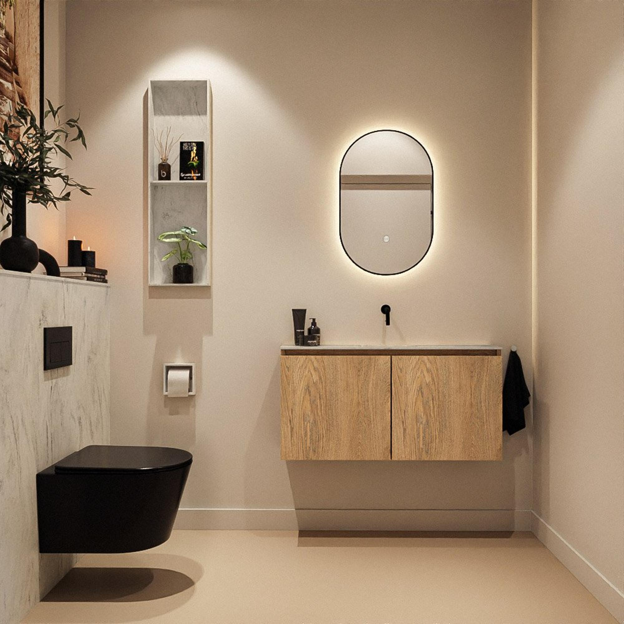 La teinte chaleureuse Washed Oak donne immédiatement à votre salle de bains une ambiance naturelle et conviviale, tandis que le design épuré et les lignes droites s’intègrent parfaitement dans un style moderne ou scandinave. Le plan vasque en Solid Surface dans une teinte grise offre un aspect mat raffiné qui rappelle la pierre naturelle haut de gamme, mais avec les avantages d’un matériau synthétique homogène. La vasque est réalisée sans trou de robinet, ce qui vous laisse toute liberté pour choisir par exemple un mitigeur de lavabo à poser sur le plan ou encastré dans le mur. Vous créez ainsi facilement votre propre look de salle de bains d’hôtel haut de gamme, avec une combinaison intemporelle de bois, d’aspect pierre et de robinets modernes.