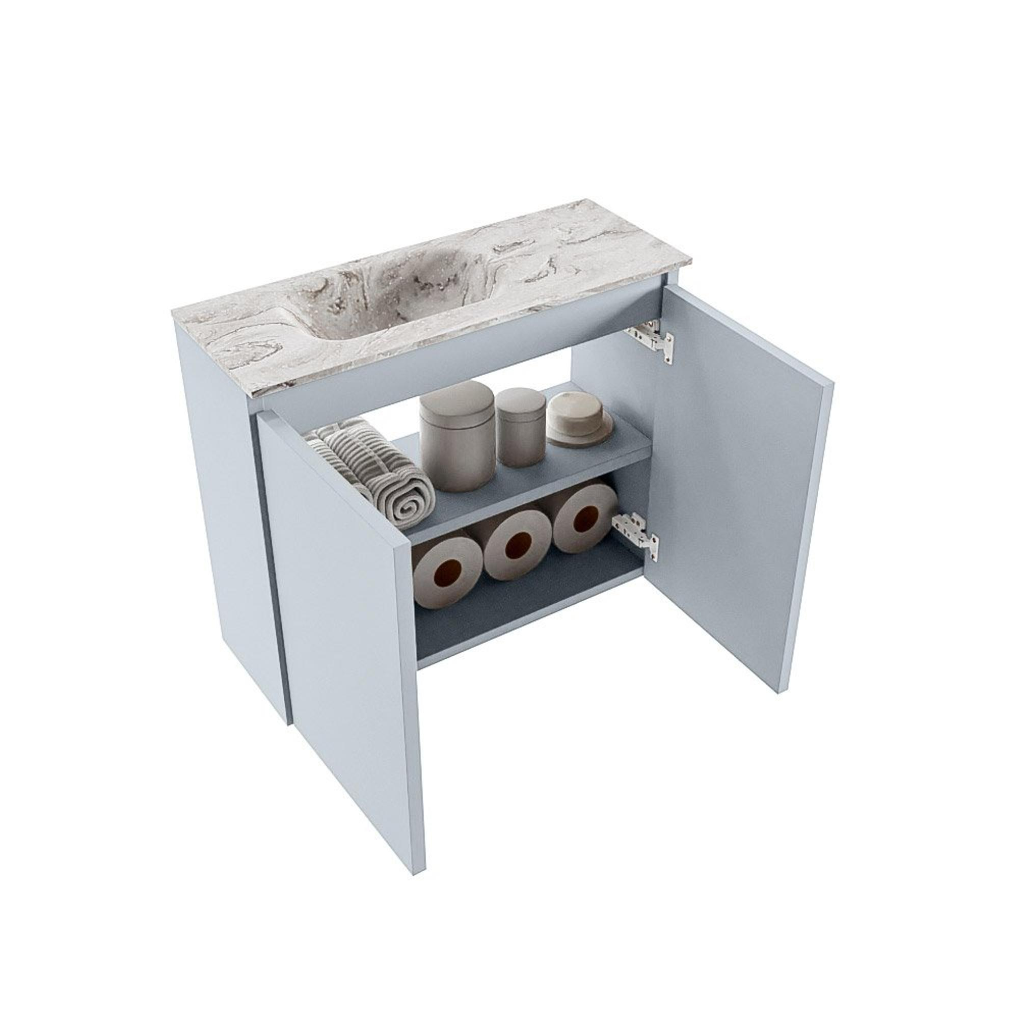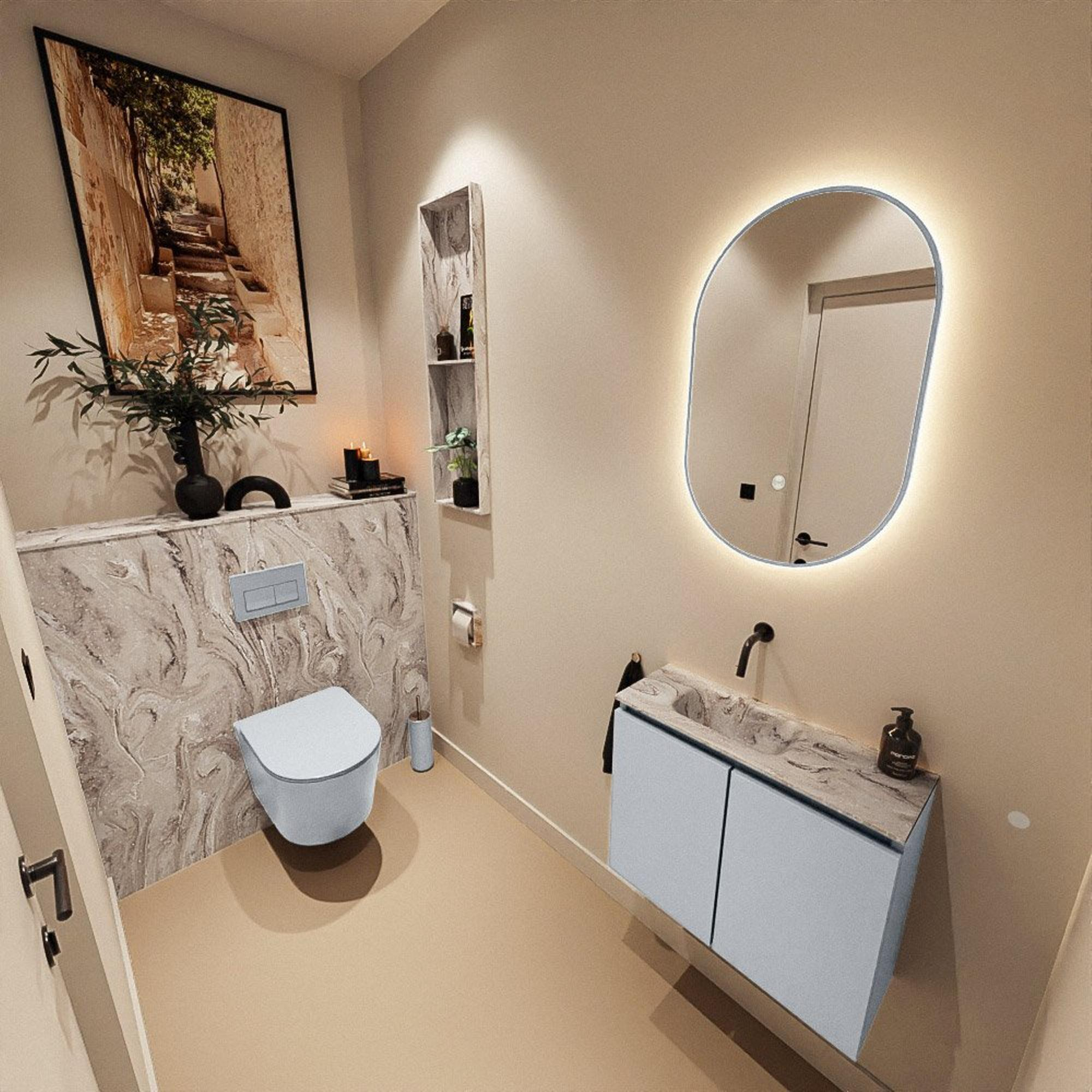 Si vous recherchez un meuble WC élégant et compact qui prend peu de place, mais offre une grande apparence et un grand confort d'utilisation, alors cet ensemble est un choix judicieux. Avec une largeur de 60 cm et une faible profondeur de 23 cm, il s'intègre parfaitement dans un espace WC ou une petite salle de bains où chaque centimètre compte. Le meuble moderne sans poignées de la couleur chaleureuse Clay se combine parfaitement avec le lavabo élégant aspect marbre, ce qui donne immédiatement à vos toilettes une apparence haut de gamme et contemporaine. Grâce au lavabo positionné à gauche, vous conservez une surface de pose pratique, idéale pour le savon ou les accessoires. Ce meuble convient particulièrement si vous aimez les lignes épurées, les matériaux modernes et un aspect calme et harmonieux, sans faire de compromis sur l'utilisation pratique et la facilité d'entretien.