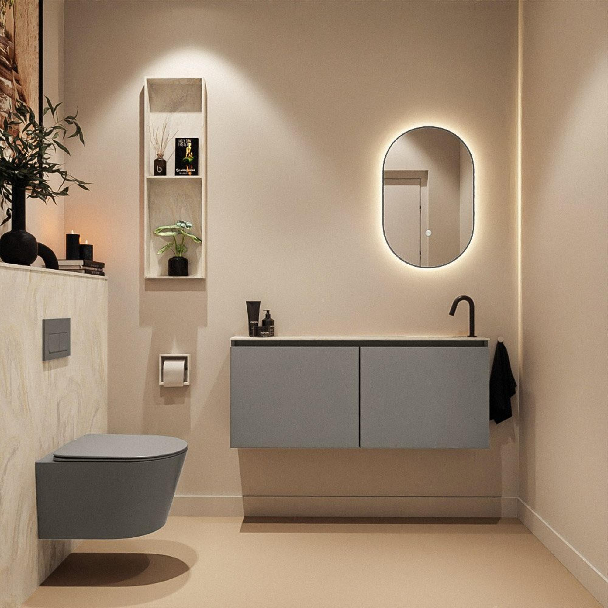 Avec une largeur de 120 cm et une profondeur de seulement 23 cm, ce meuble est parfait pour les toilettes longues et étroites ou les salles de bains compactes. La faible profondeur vous permet de conserver votre espace de circulation et de vous déplacer librement, sans que le meuble gêne. En même temps, la largeur généreuse crée un aspect luxueux, presque flottant le long du mur. La position de la vasque sur le côté droit rend l’ensemble très adapté lorsque, par exemple, vous disposez de plus d’espace à droite de la porte ou souhaitez créer un cheminement logique. Vous combinez ainsi une utilisation optimale de l’espace avec une image calme et symétrique dans vos toilettes.