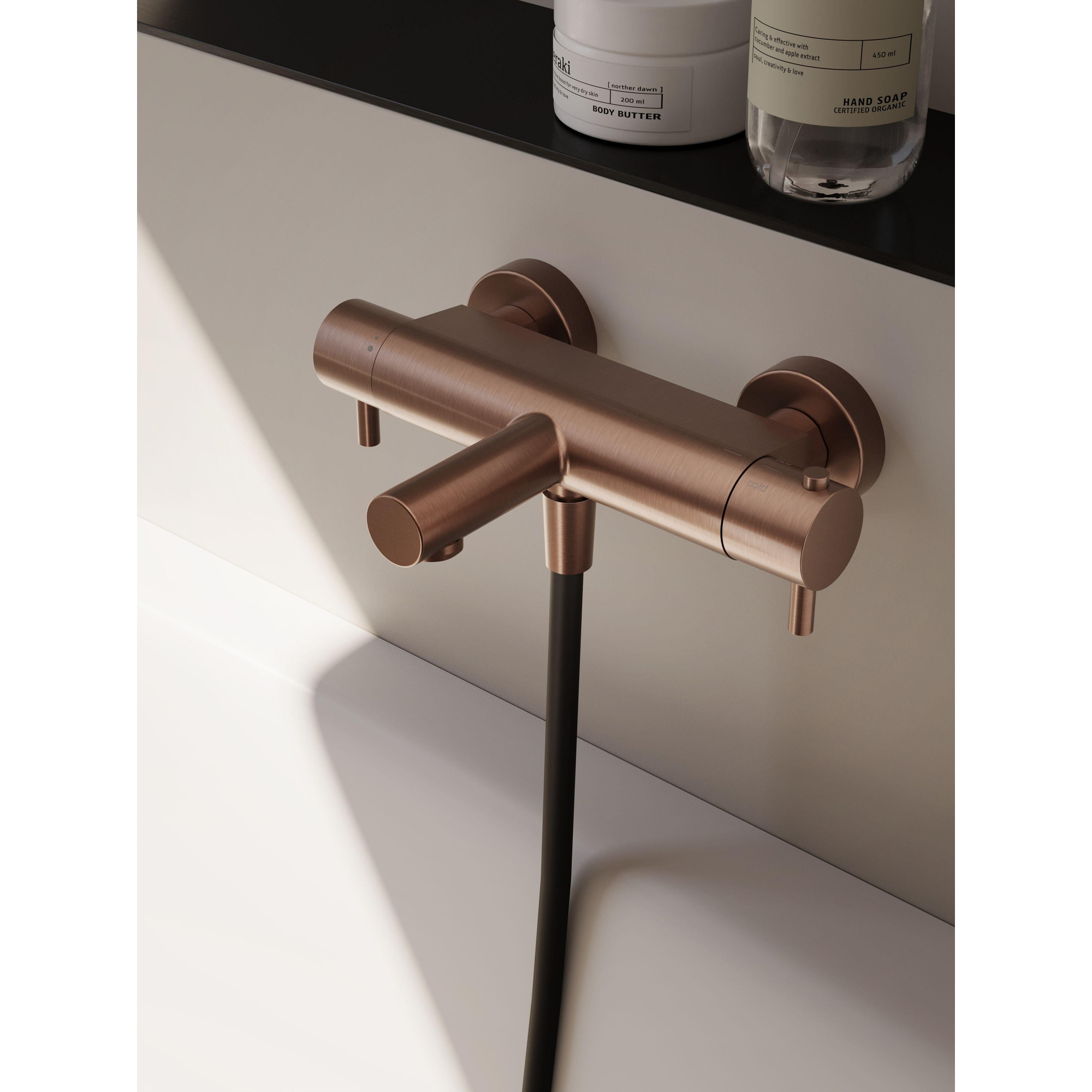 Une salle de bains est plus qu’un simple espace fonctionnel, c’est un lieu où vous vous détendez et vous vous faites plaisir. Avec ce magnifique design de mitigeur de baignoire, vous donnez à votre salle de bains une apparence chaleureuse et luxueuse qui attire immédiatement le regard. La combinaison d’un look moderne avec une finition unique en cuivre brossé PVD crée une atmosphère intemporelle où le style et le confort se rejoignent. Grâce à la régulation thermostatique, vous profitez toujours de la température d’eau parfaite, sans variations ni surprises. Ainsi, le bain devient une expérience relaxante, où vous pouvez vous détendre complètement et profiter de chaque instant. Ce produit n’ajoute pas seulement une valeur pratique, il rehausse également l’apparence de votre salle de bains à un niveau supérieur.