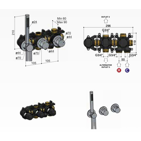 - Spécialement adapté aux mitigeurs thermostatiques encastrés avec inverseur d'arrêt 2 voies