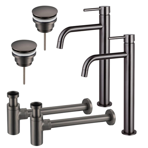 FugaFlow Eccelente Sobrado Slim Kit robinet lavabo - pour double vasque - robinet rehaussé - bonde clic clac - siphon design - Gunmetal PVD