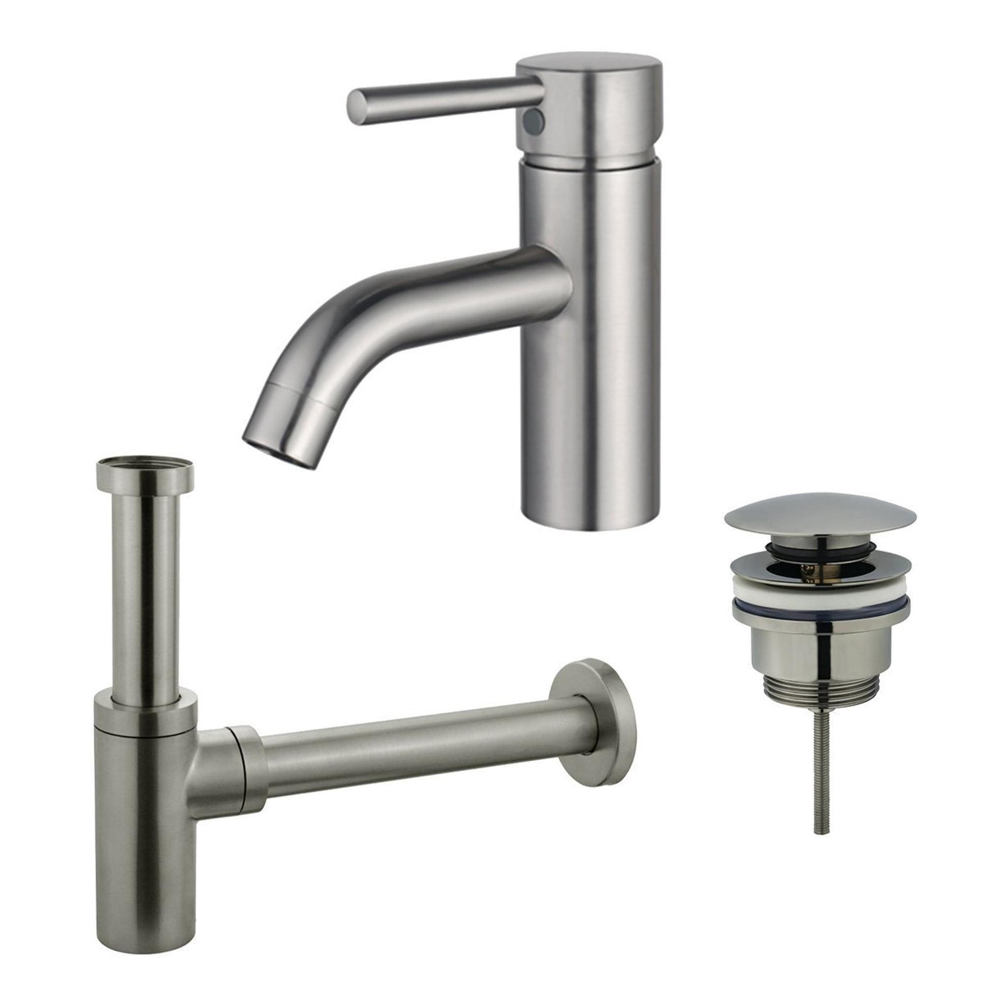 FugaFlow Eccelente Sobrado Kit mitigeur lavabo - robinet bas - bonde clic clac - siphon design - PVD Inox brossé