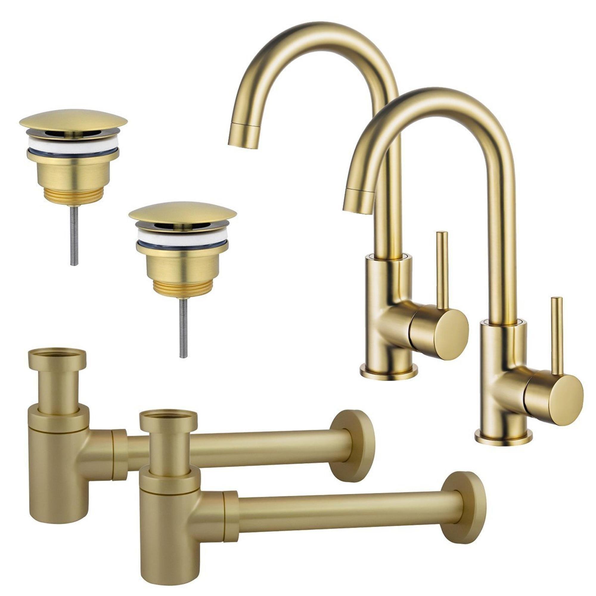 FugaFlow Eccelente Sobrado Kit robinet lavabo - pour double vasque - robinet haut - bec rotatif - bonde non-obturable - siphon design bas - Laiton brossé PVD