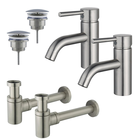 FugaFlow Eccelente Sobrado Kit robinet lavabo - pour double vasque - robinet bas - bonde non-obturable - siphon design bas - Inox brossé PVD