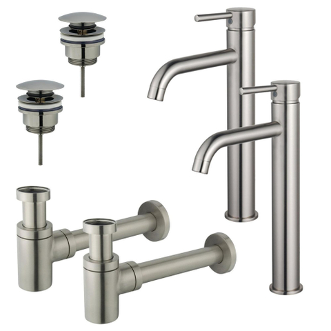 FugaFlow Eccelente Sobrado Kit robinet lavabo - pour double vasque - robinet rehaussé - bonde clic clac - siphon design bas - Inox brossé PVD