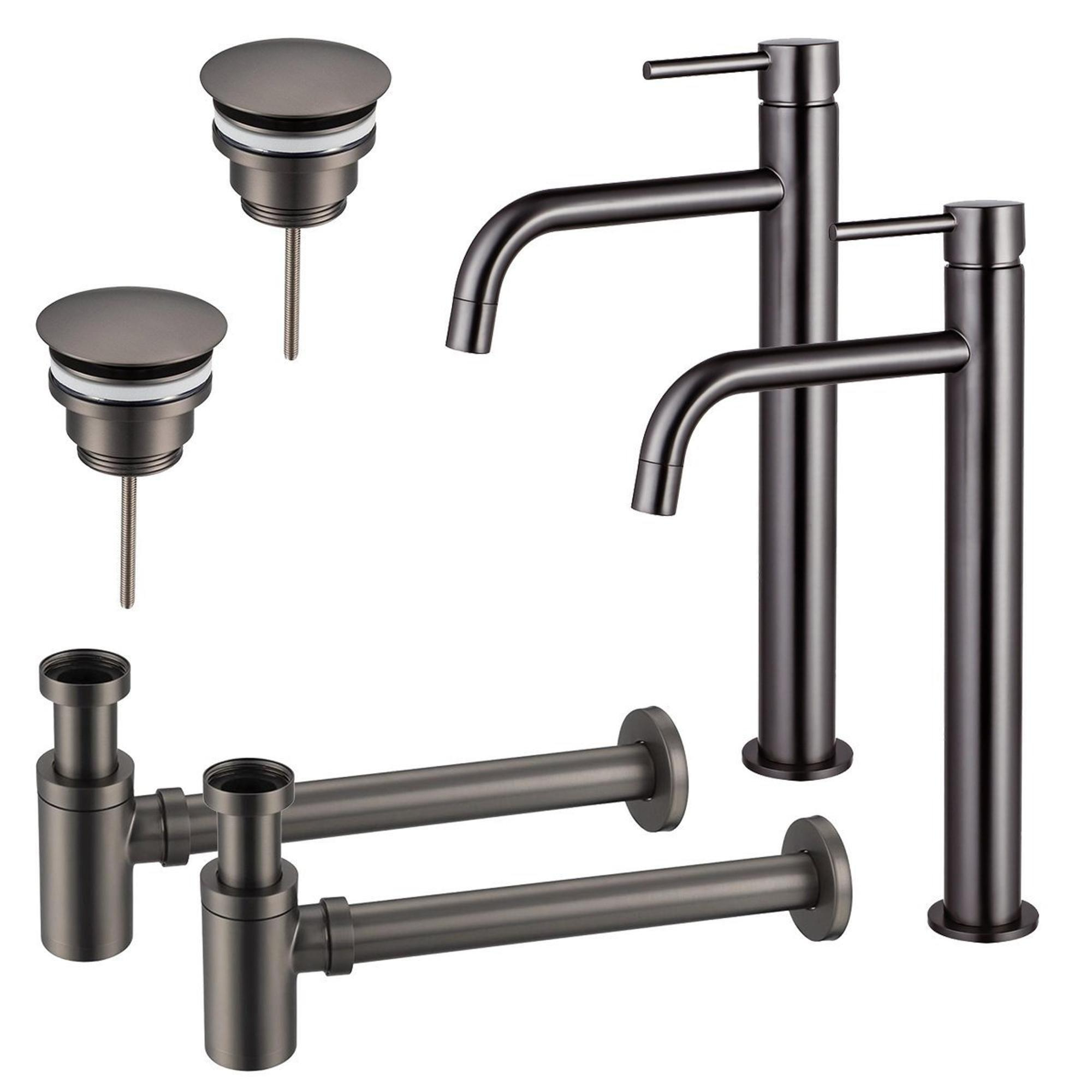 FugaFlow Eccelente Sobrado Slim Kit robinet lavabo - pour double vasque - robinet rehaussé - bonde non-obturable - siphon design bas - Gunmetal PVD