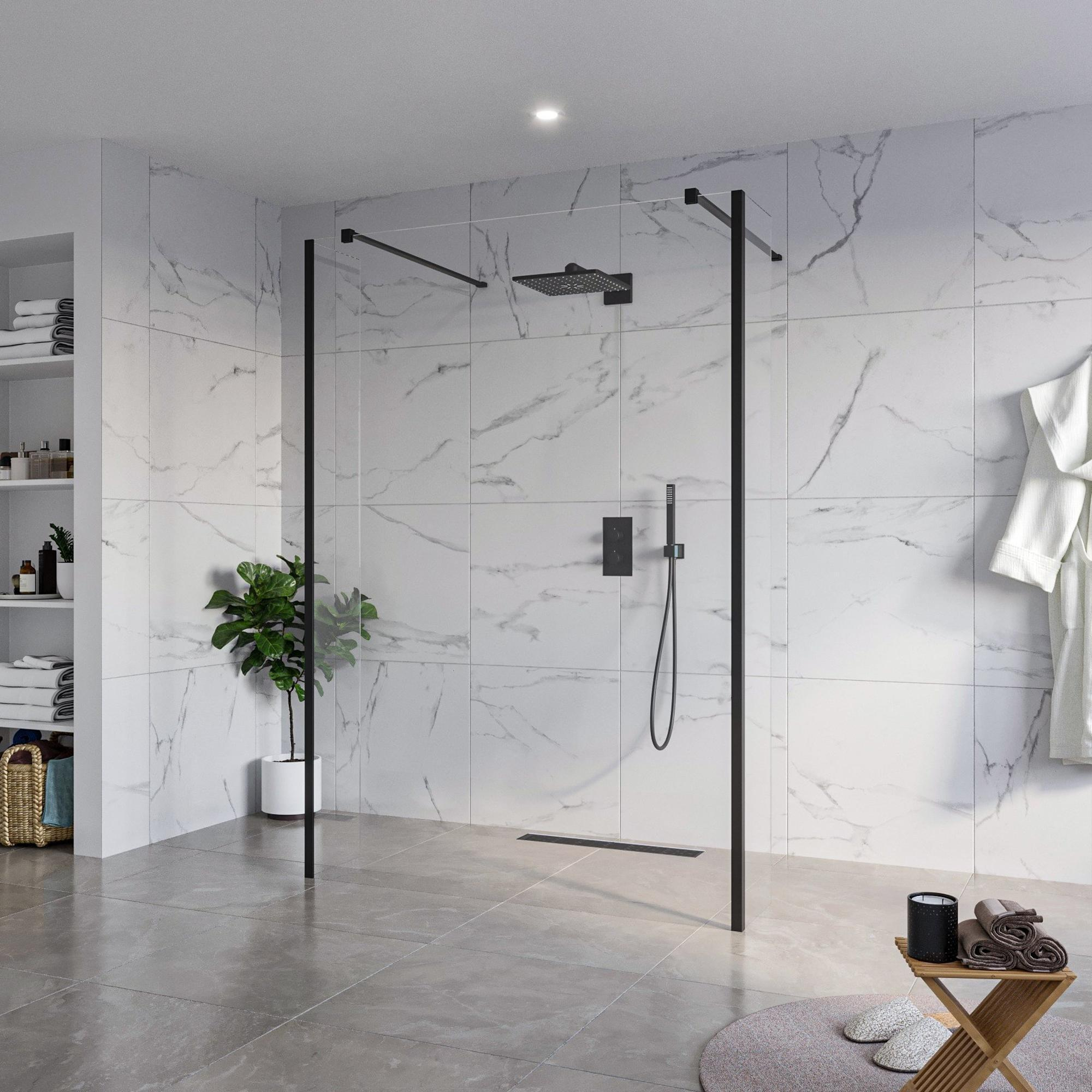 FugaFlow Eccelente Vetro Douche à l'italienne Libre - 140x200cm - Clair - anti-calcaire - verre de sécurité 8mm - 2 parois latérales 30cm - avec bras muraux et profils d'angle - Noir mat
