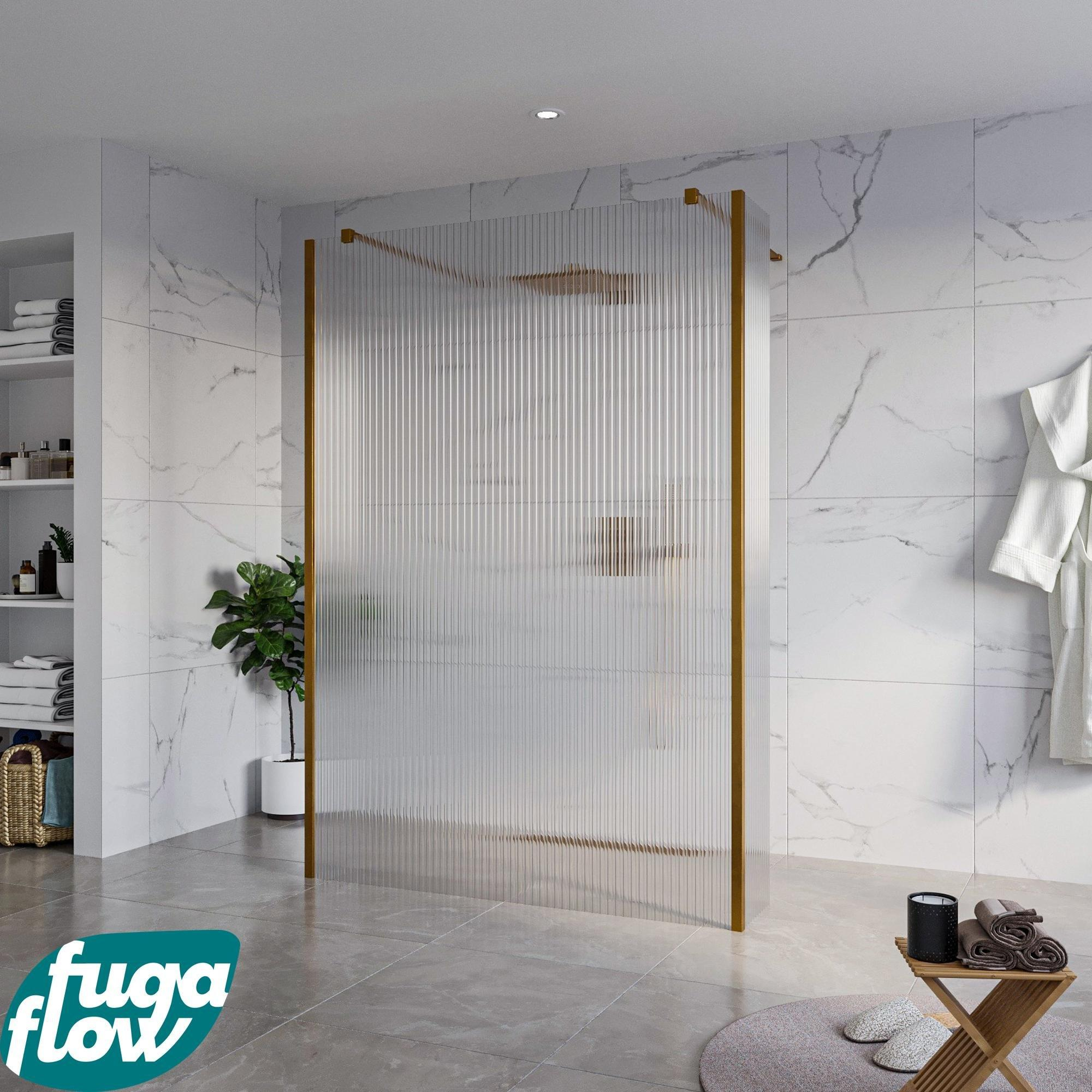 FugaFlow Eccelente Vetro Douche à l'italienne - 140x200cm - verre clair nervuré - anticalcaire - verre de sécurité 8mm - 2 parois latérales 40cm - avec bras muraux et profilés d'angle - Cuivre brossé