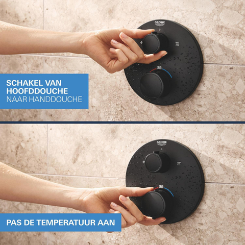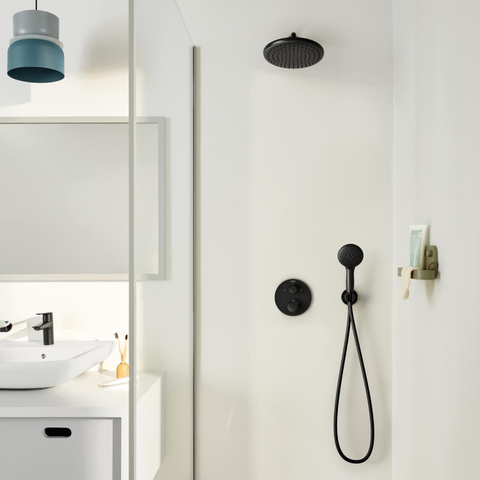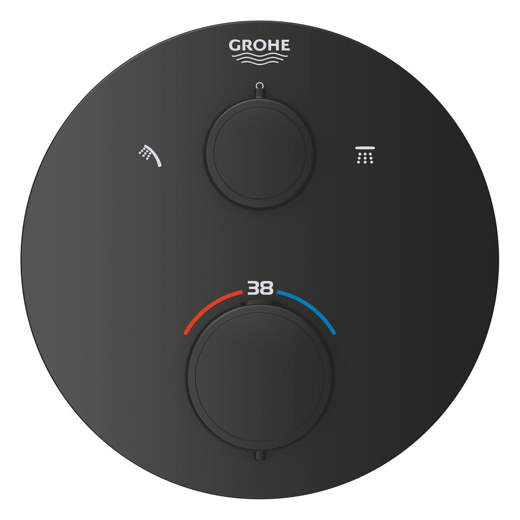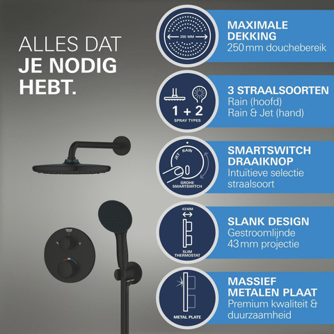Grohe Precision Ensemble de douche complet - douchette de 11cm offrant 2 types de jets - tête de douche 25cm - mitigeur de douche encastré thermostatique - rond - avec inverseur - noir mat