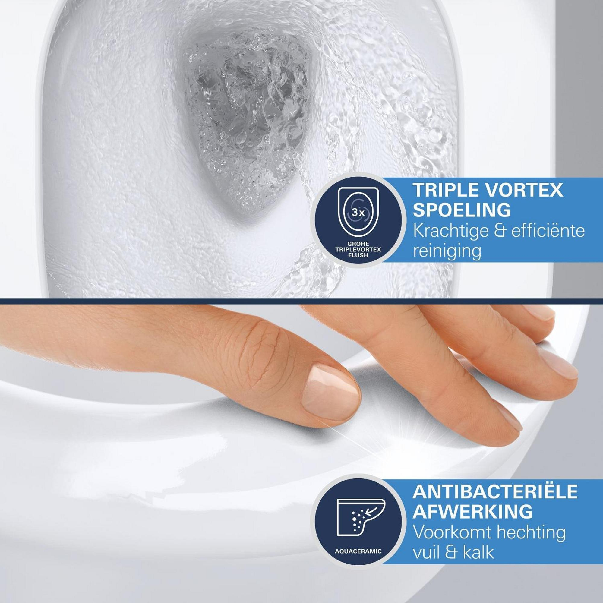 La puissante chasse d'eau GROHE Triple Vortex nettoie et couvre l'intégralité de la cuvette, tandis que la conception sans rebord de la cuvette ne laisse aucune chance aux bactéries de s'installer.