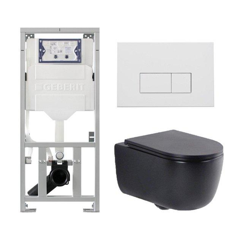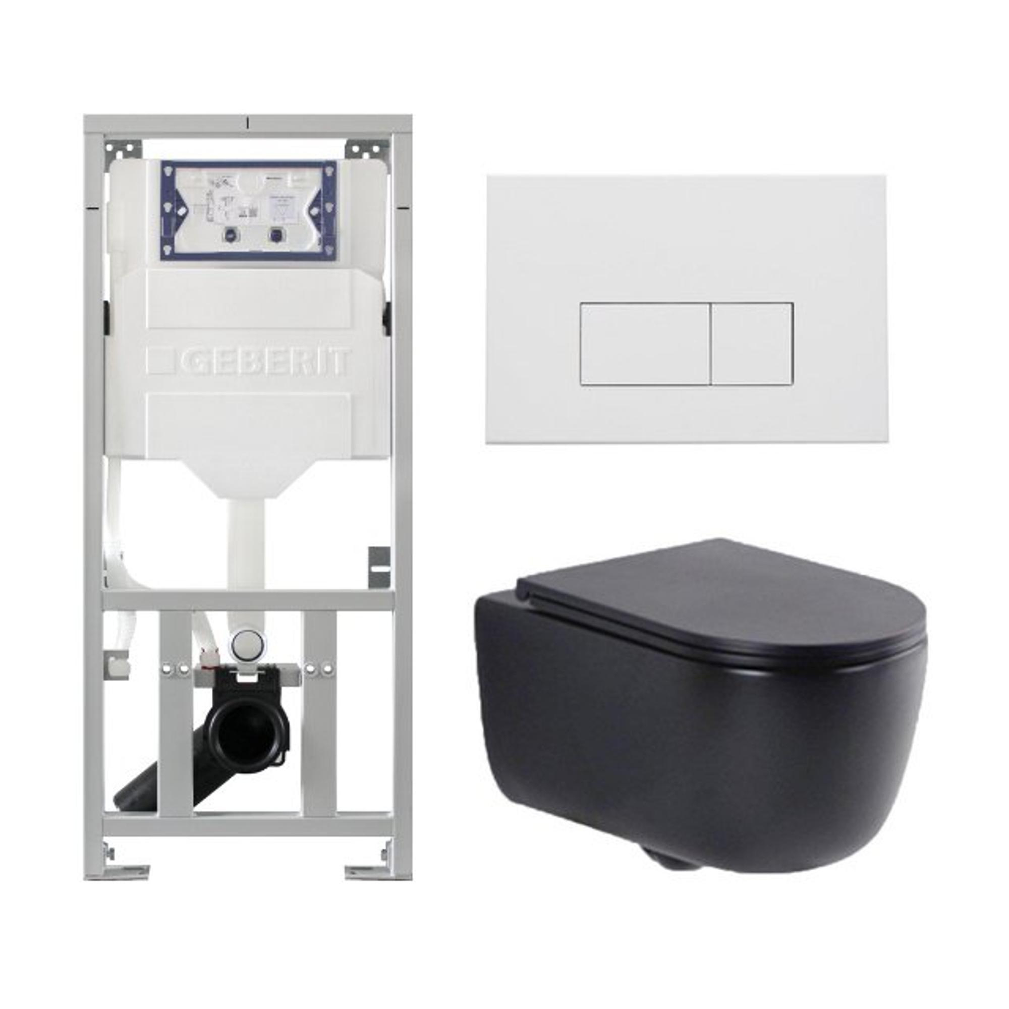QeramiQ Dely Swirl Ensemble WC - 36.3x51.7cm - Réservoir encastré Geberit UP320 - abattant fin - Plaque de commande en métal blanc mat - Boutons rectangulaires - Noir mat