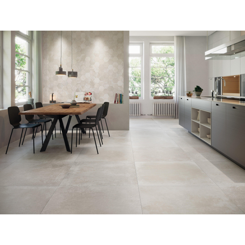- Issu d'un grand carreau de sol et de mur en céramique 90x90 cm en chaleureuse finition aspect béton crème.