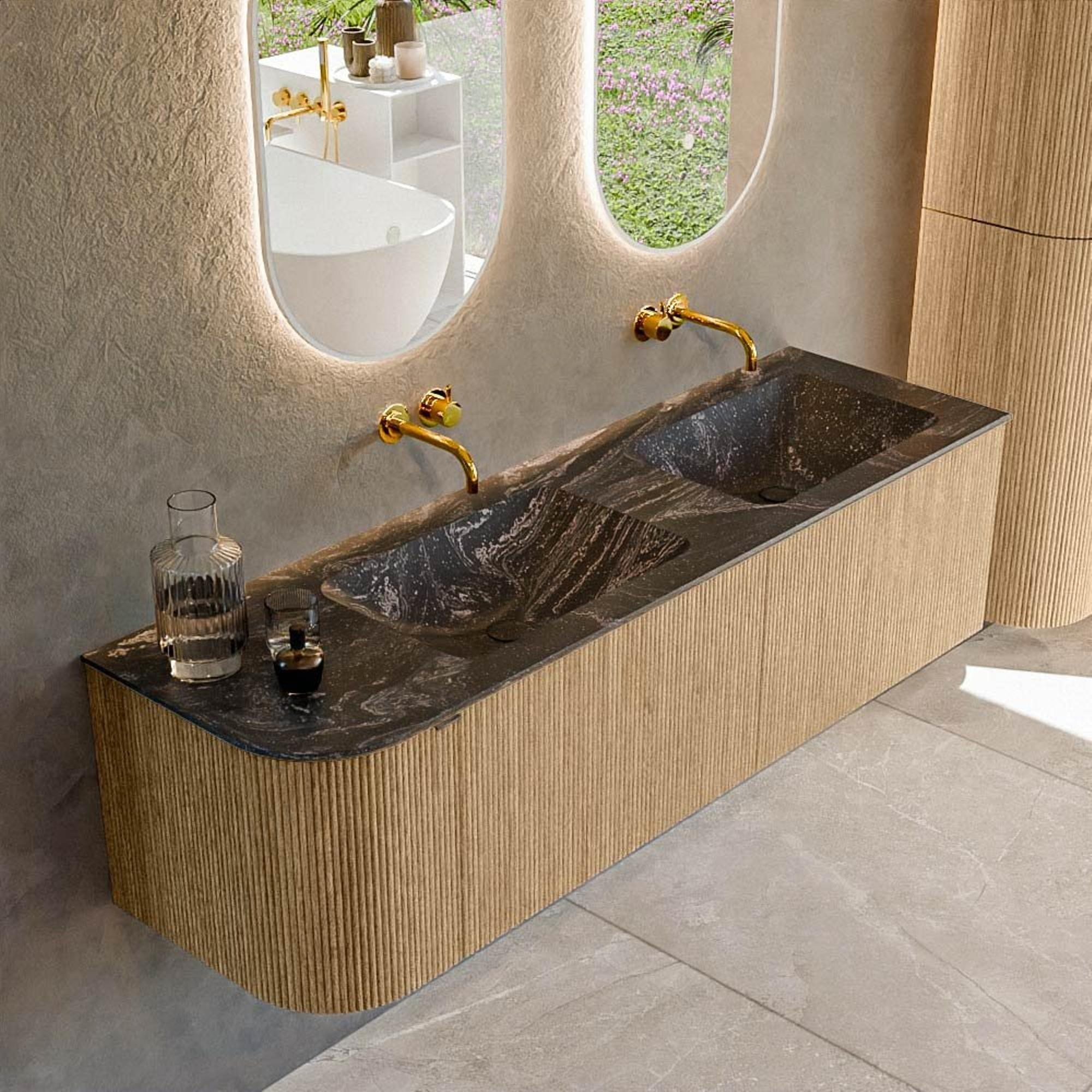 MONDIAZ KURVE-DLUX Meuble de salle de bains 155 cm avec module 25 L couleur Chêne avec 2 tiroirs et 1 porte. Lavabo LEAF double / droite sans trou de robinet couleur Lava.