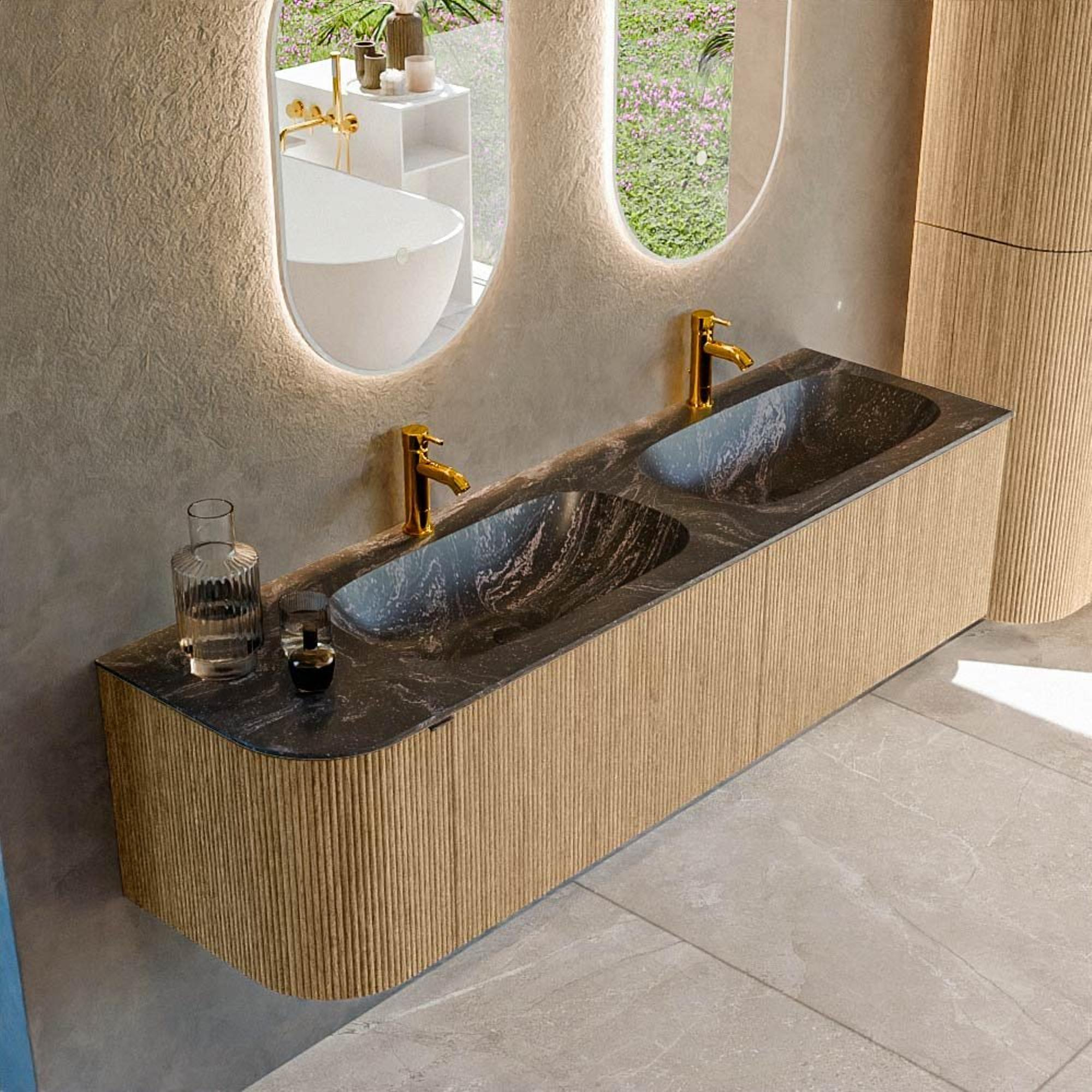 MONDIAZ KURVE-DLUX meuble de salle de bains 165 cm avec module 25 L couleur Chêne avec 2 tiroirs et 1 porte. Lavabo STOR SMALL double / à droite 2 trous de robinet couleur Lava.