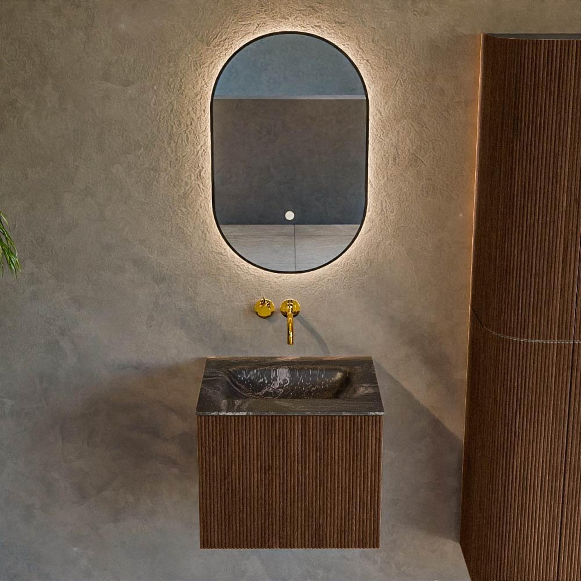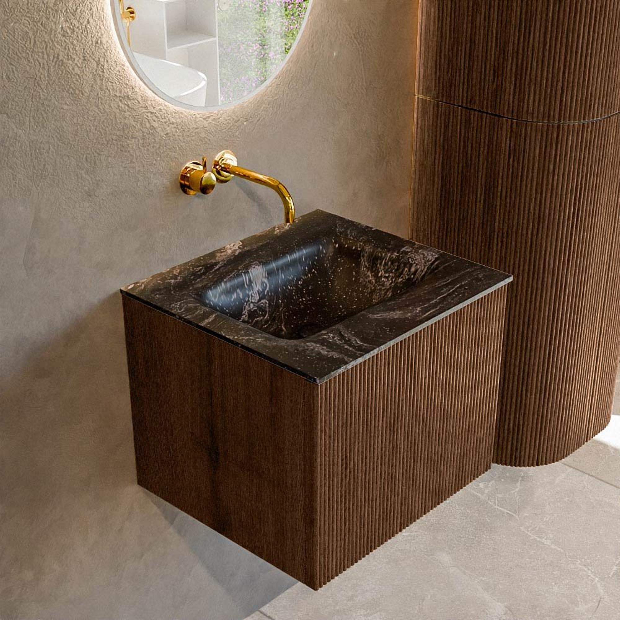 MONDIAZ KURVE-DLUX Meuble de salle de bains 50 cm couleur Walnut avec 1 tiroir. Lavabo GRUNNE central sans trou de robinet couleur Lava.