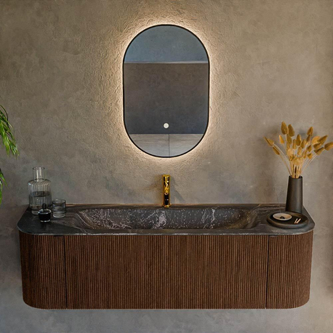 Grâce à sa forme rectangulaire aux angles arrondis, votre salle de bains bénéficie d’une apparence plus douce et plus accueillante qu’avec un meuble droit et anguleux. Les formes arrondies ne sont pas seulement agréables à regarder, elles sont aussi plus sûres et plus confortables, en particulier dans une salle de bains familiale animée. Avec sa largeur de 150 cm, ce meuble offre un large espace de travail et de dépose autour du lavabo, idéal lorsque vous êtes deux à utiliser la salle de bains en même temps. La combinaison de la teinte bois noyer et du lavabo Lava en anthracite crée un look moderne mais néanmoins intemporel, qui s’accorde parfaitement avec les salles de bains de style industriel, scandinave ou design. Comme le meuble est suspendu au mur, le sol reste dégagé, ce qui agrandit optiquement votre salle de bains et la rend plus paisible.